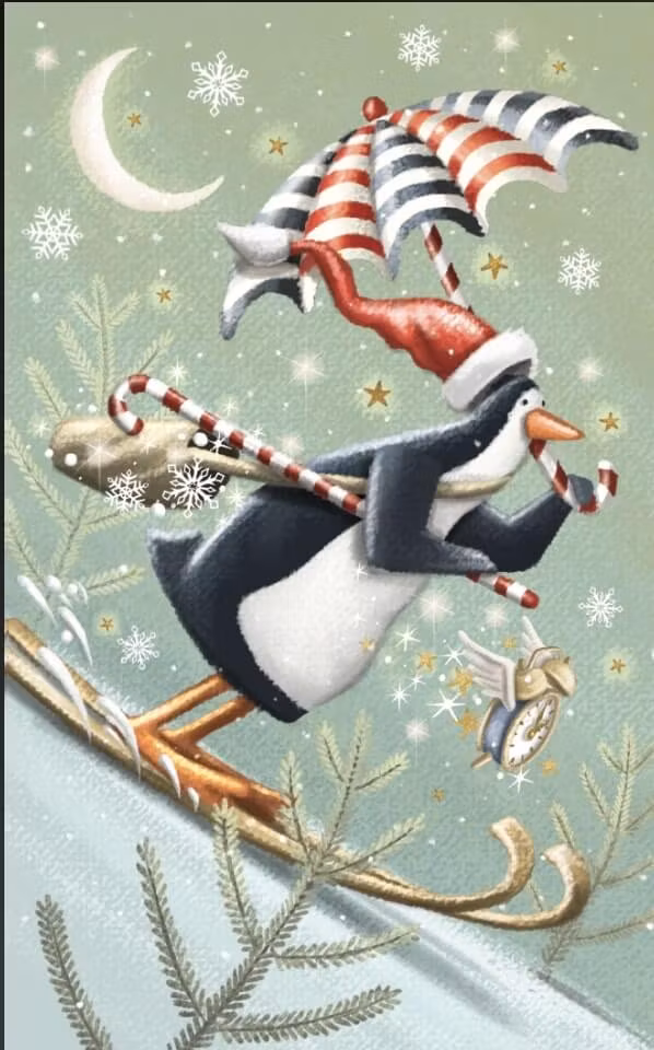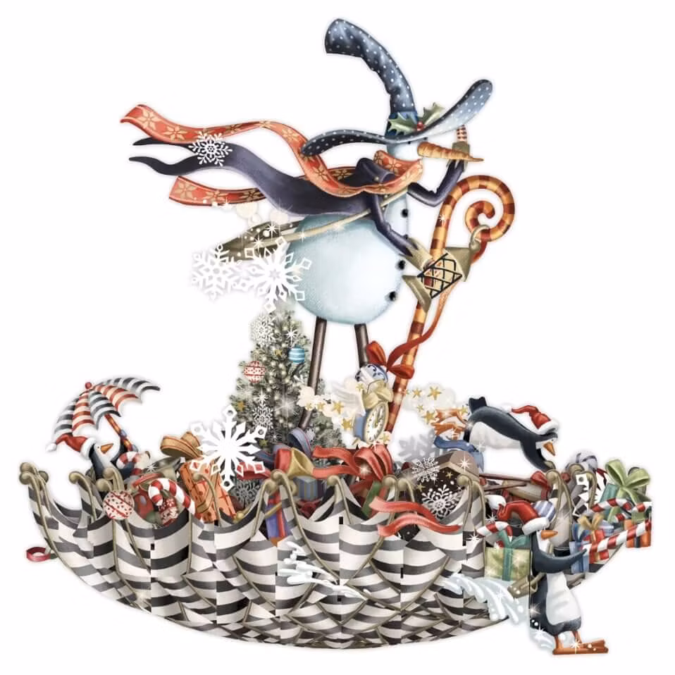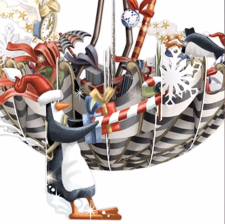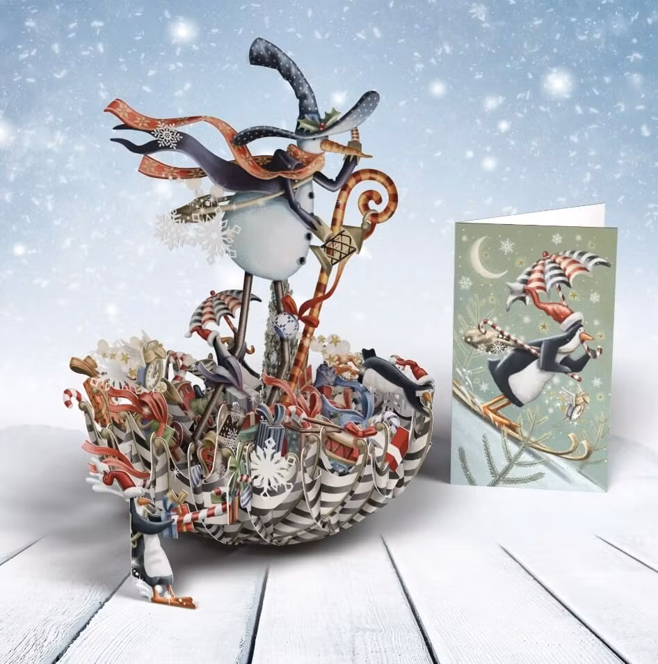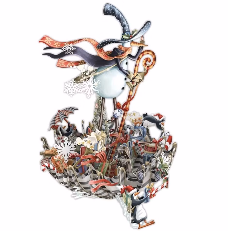 Här är ett julkort fullt av paraplyer, pingviner och en snögubbe. Underbart julkort som du viker ut och viker upp.