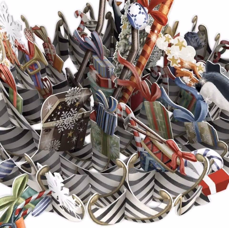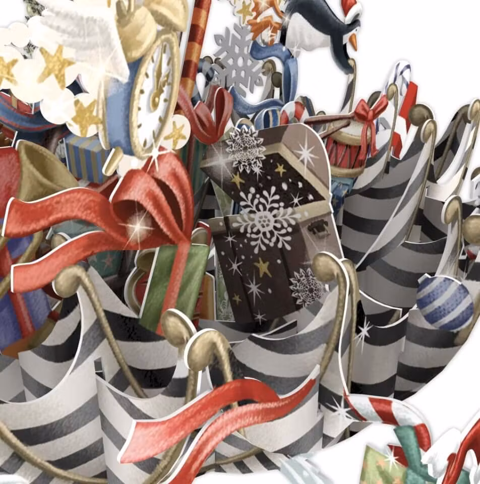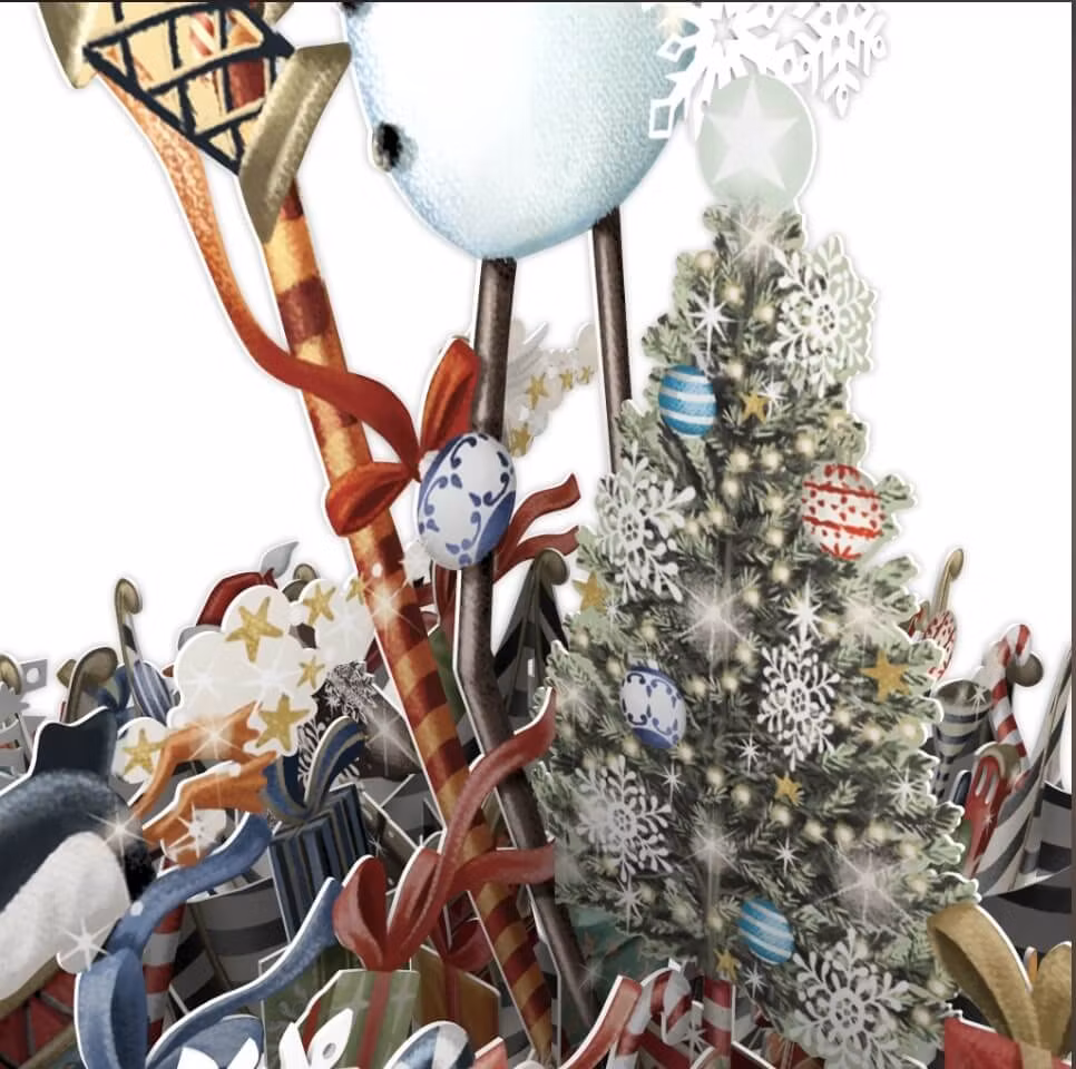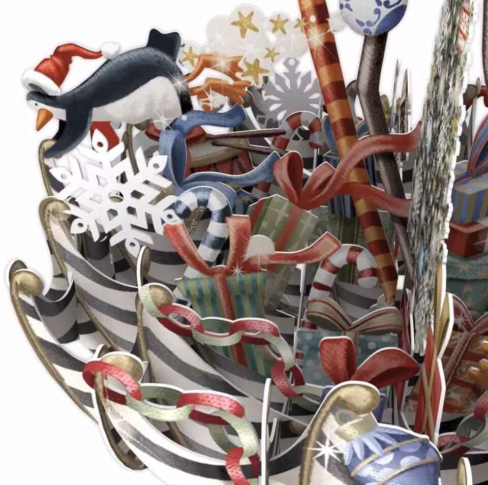 Här är ett julkort fullt av paraplyer, pingviner och en snögubbe. Underbart julkort som du viker ut och viker upp.