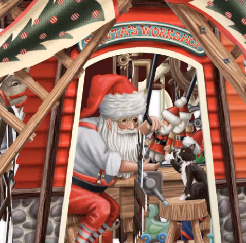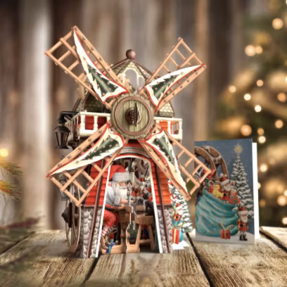 Vem visste att tomten hade sin fabrik i en gammal väderkvarn? Underbart julkort som du viker ut och viker upp.