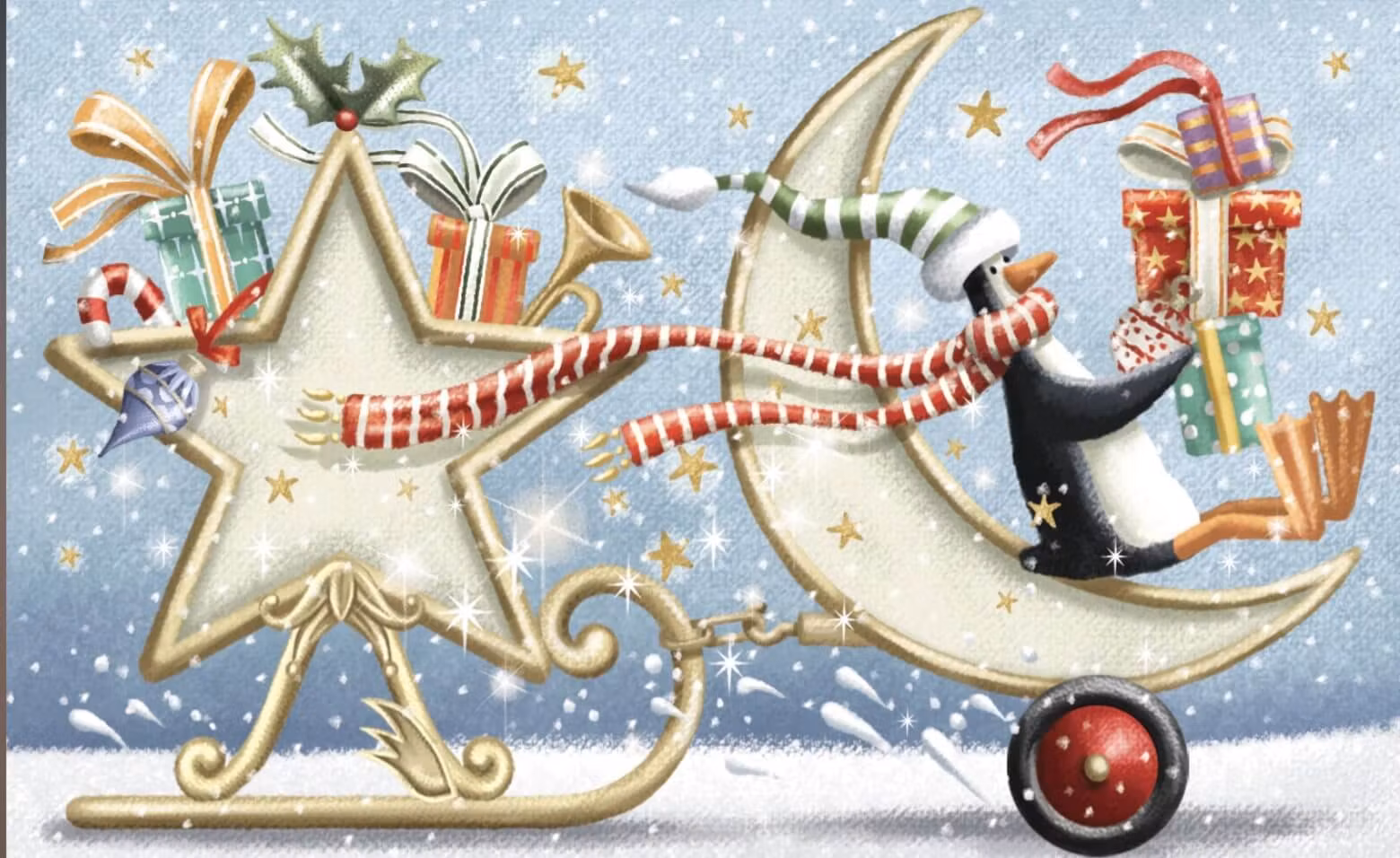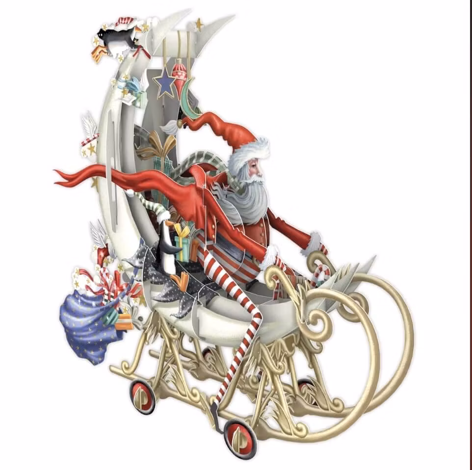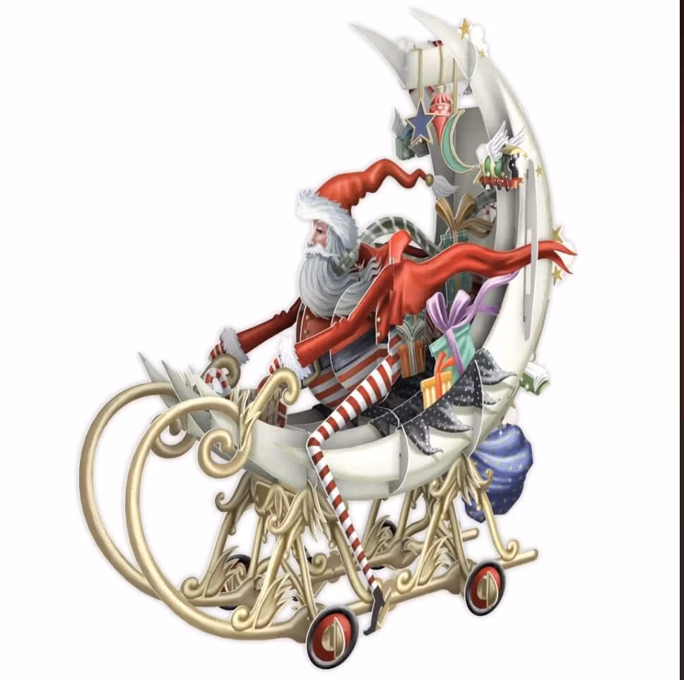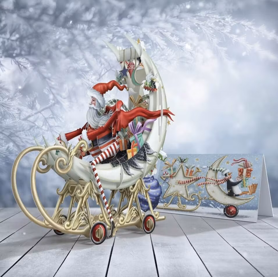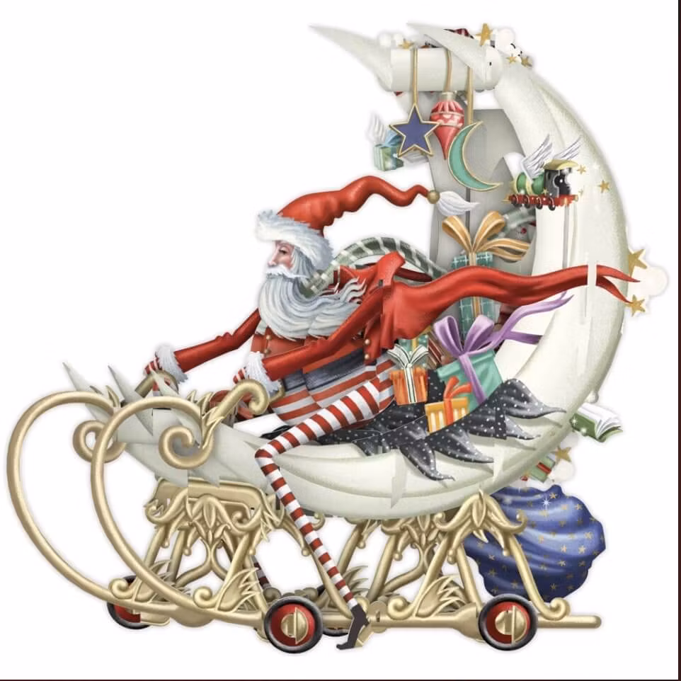 Här är ett julkort med tomten som kommer i full fart i sin vackra månsläde.
