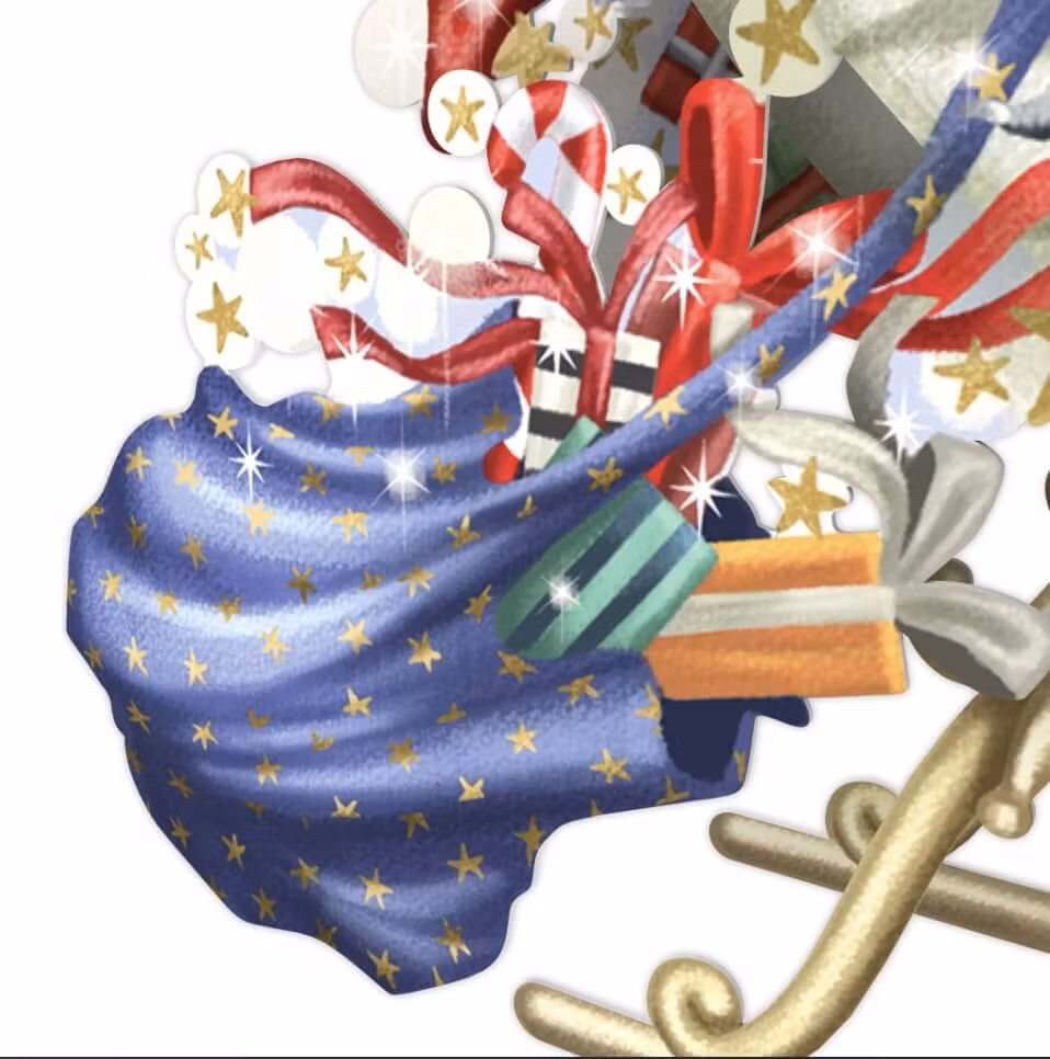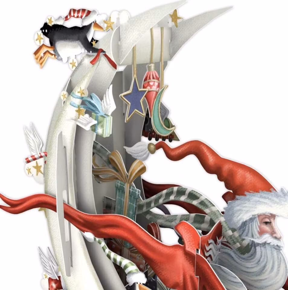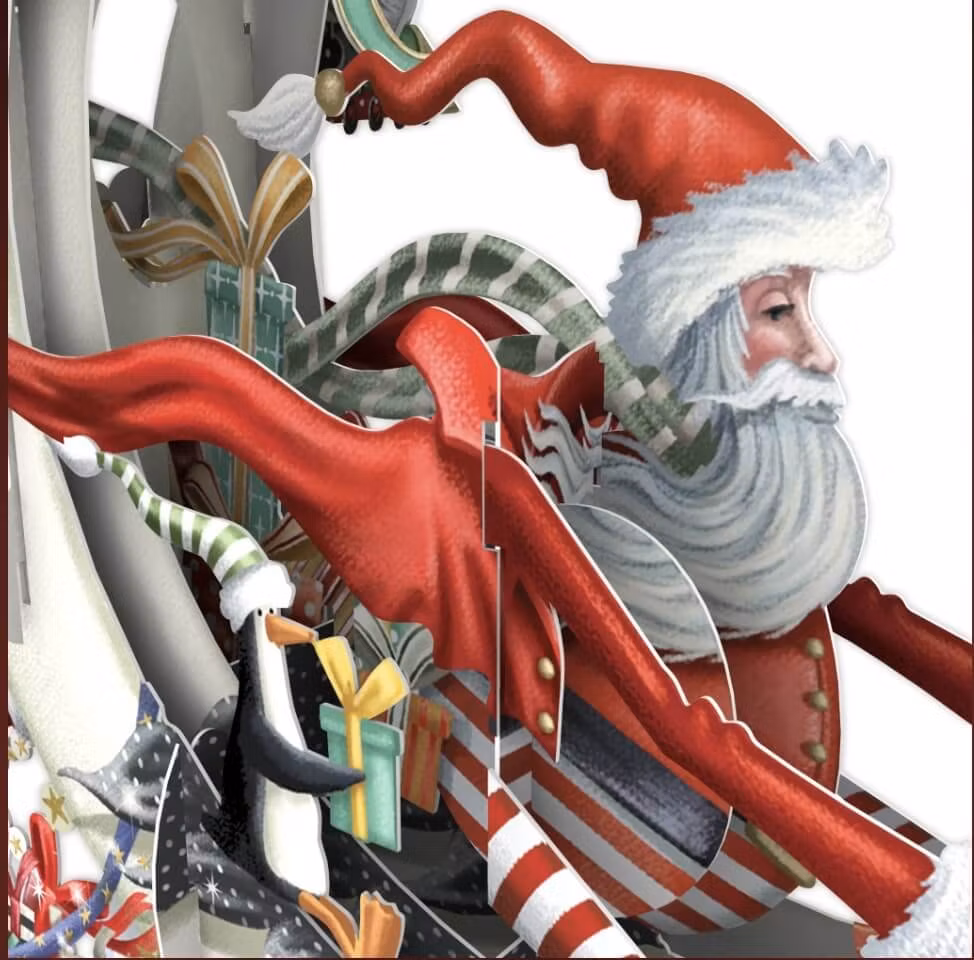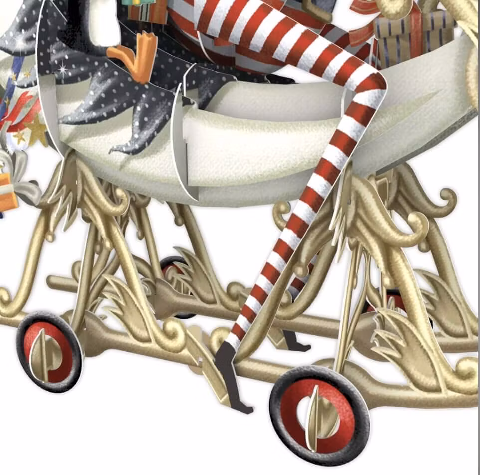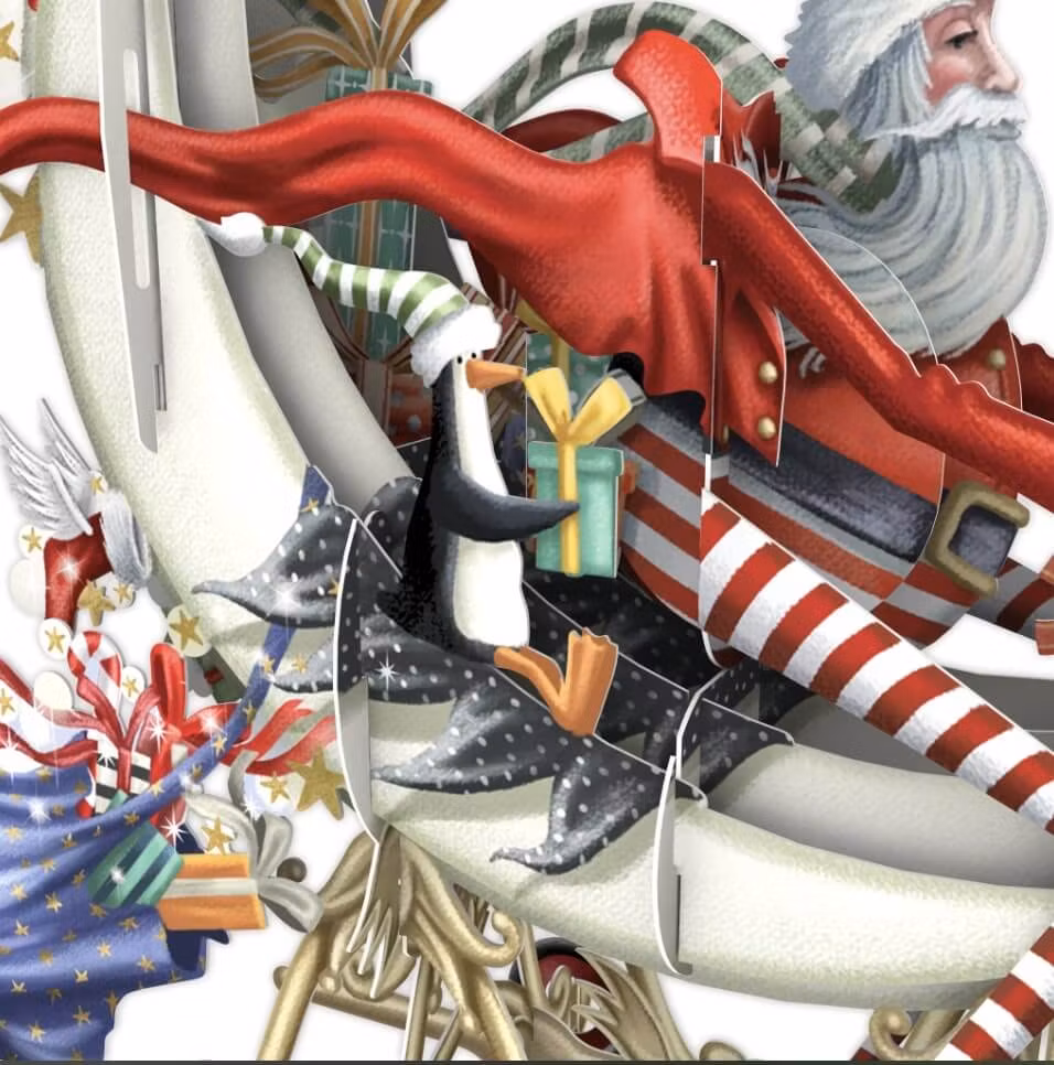 Här är ett julkort med tomten som kommer i full fart i sin vackra månsläde.