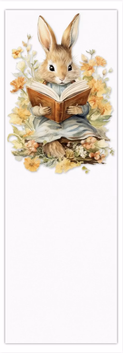 Hitta lätt och rätt till där du slutade läsa med ett fint bokmärke! Här är ett fint bokmärke med kaninen som läser sin bok mitt bland alla de gula blommorna.