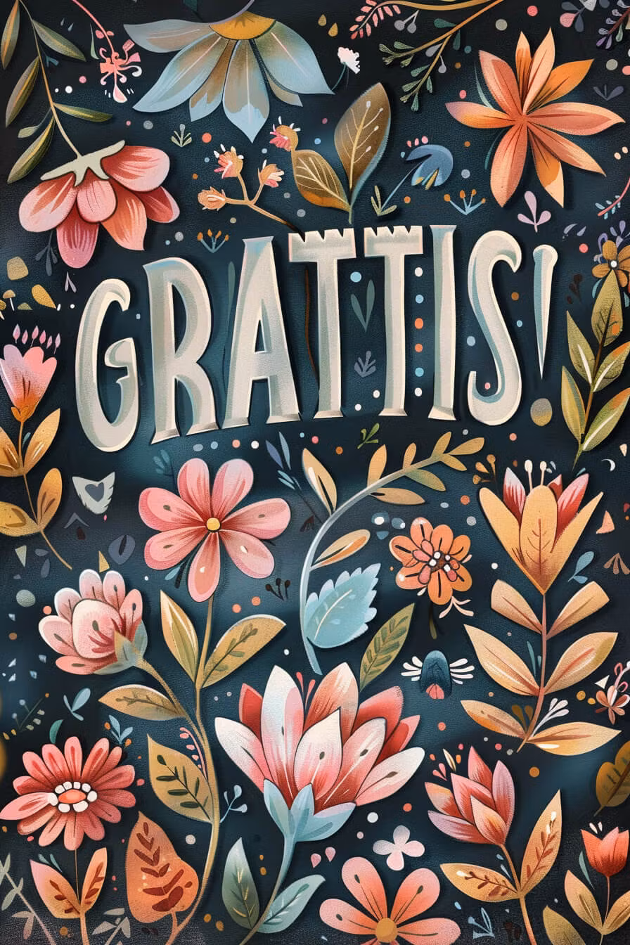 Härligt grattiskort i vackra, varma färger och en massa blommor och andra växter. Mitt bland all grönska finns ordet "Grattis!" på framsidan av kortet.
