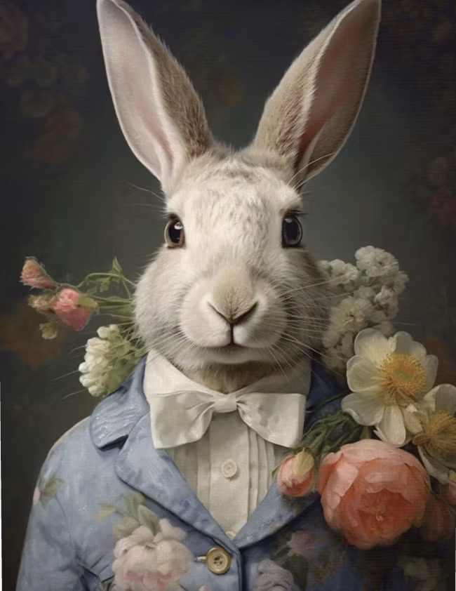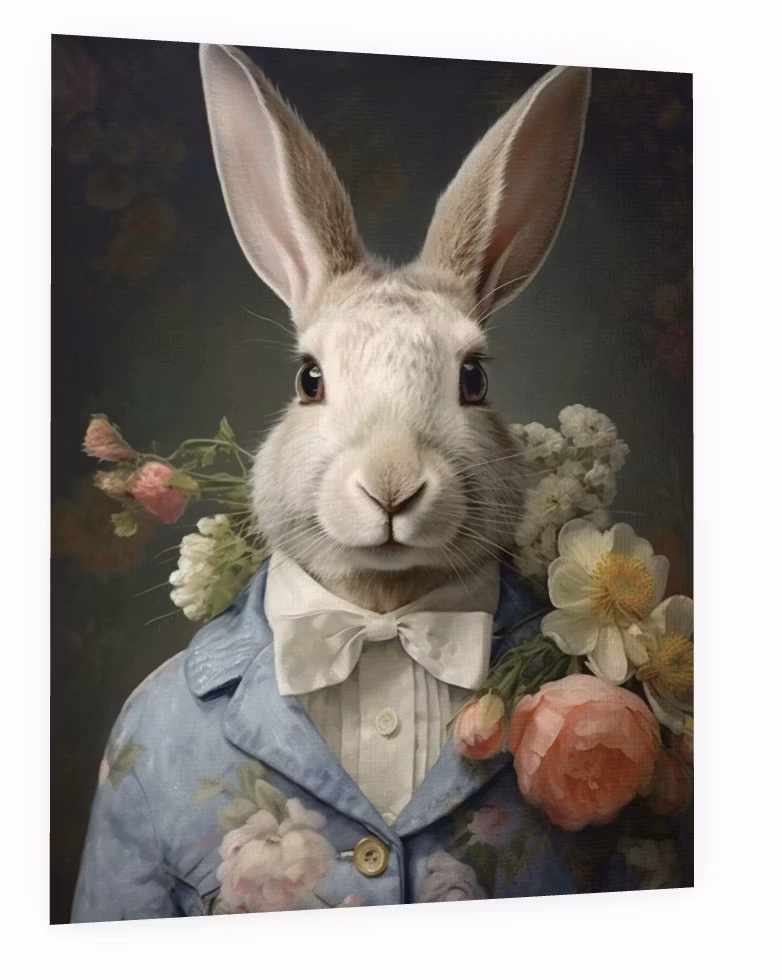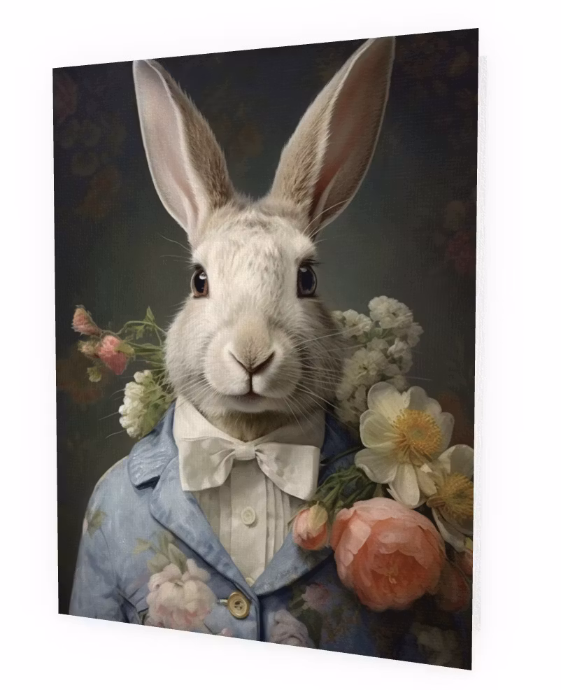 Underbart kort med den ståtliga kaninen som står i sin vackra kavaj mitt bland alla blommorna.