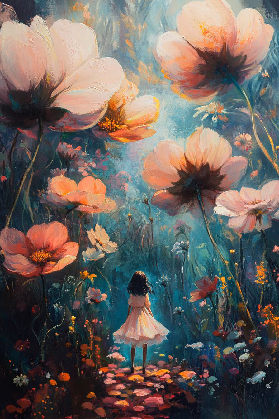 Underbart kort med de enorma blommorna och den lilla flickan och vandrar förundrat mellan dem.