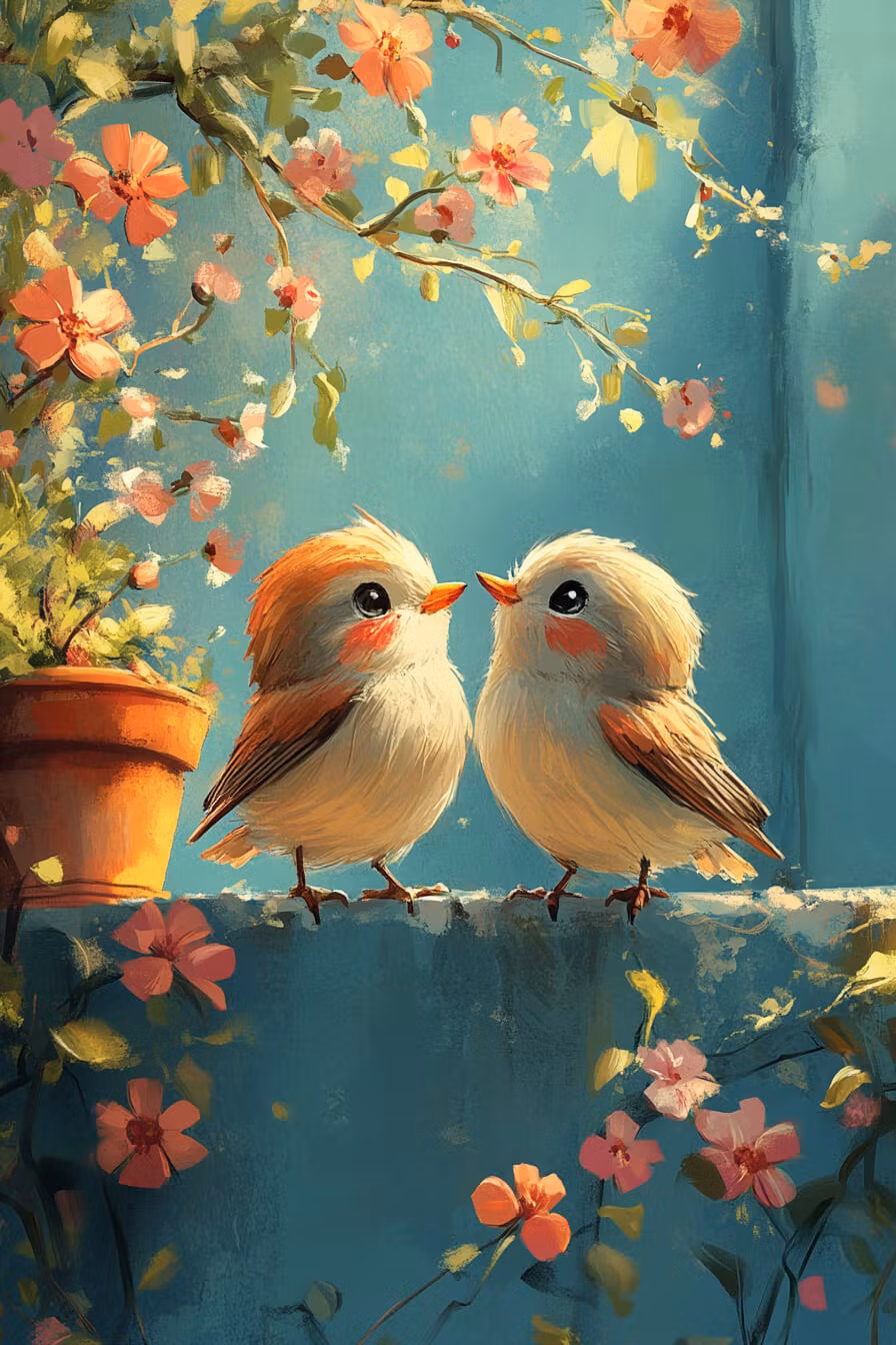 Underbart fint kort med de två små fågelvännerna som sitter tillsammans på muren.