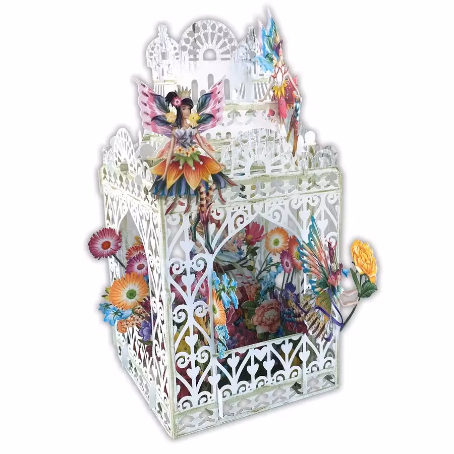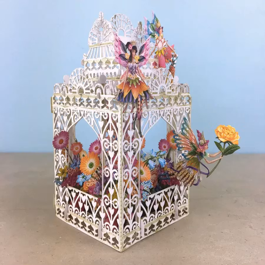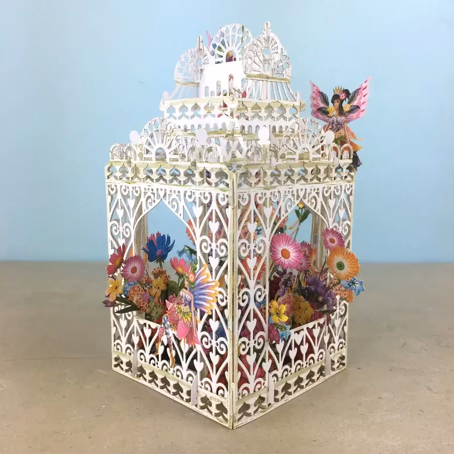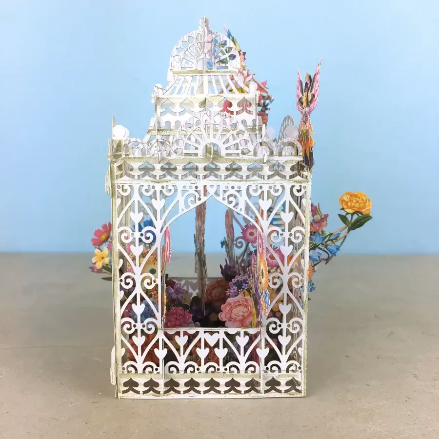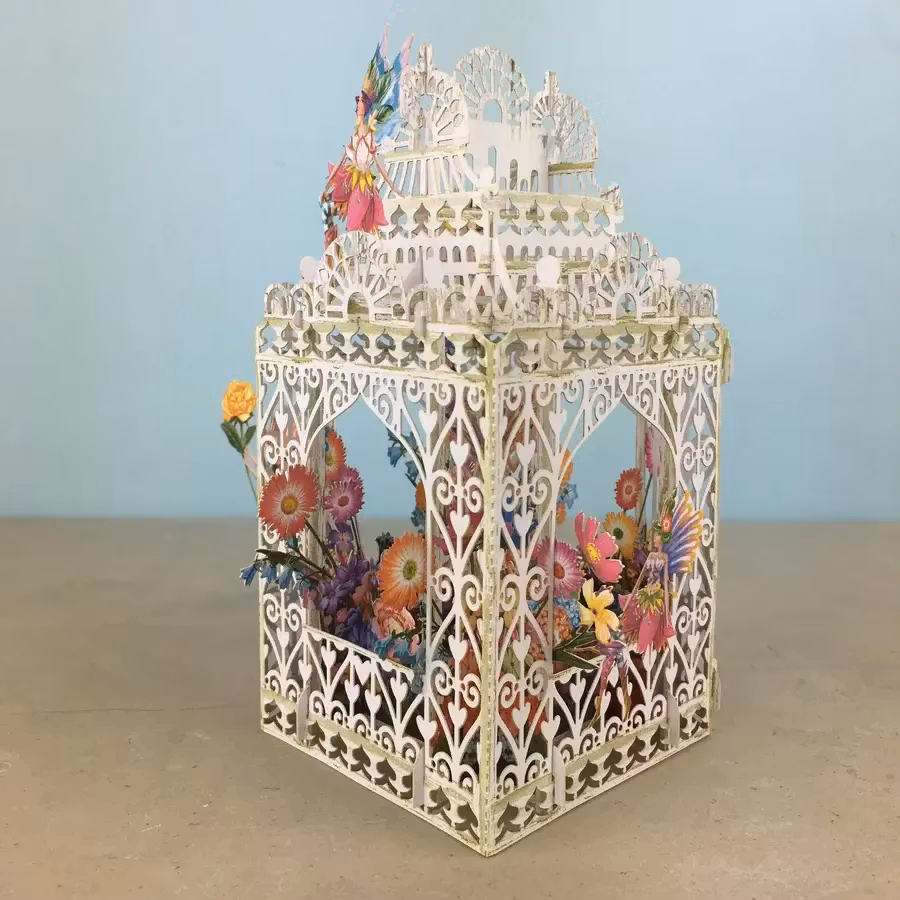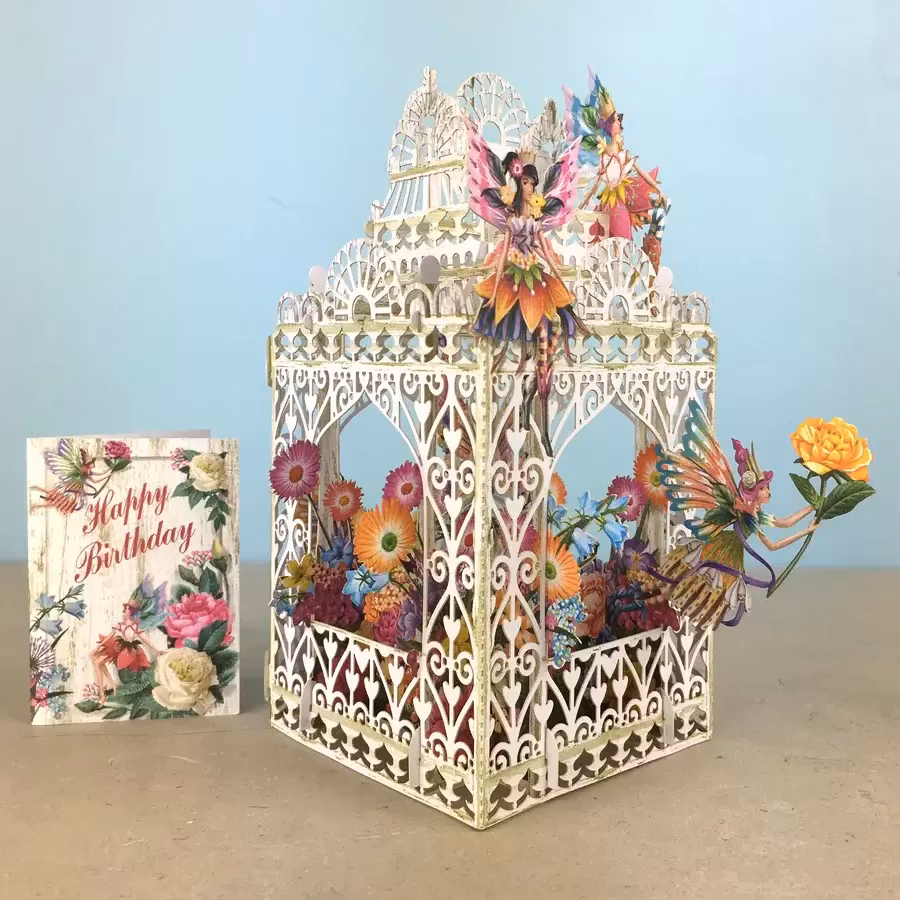 Härligt kort som levereras platt till mottagaren men som sedan viks upp och ut för att förvandlas till en vacker prydnad att ha på bordet.