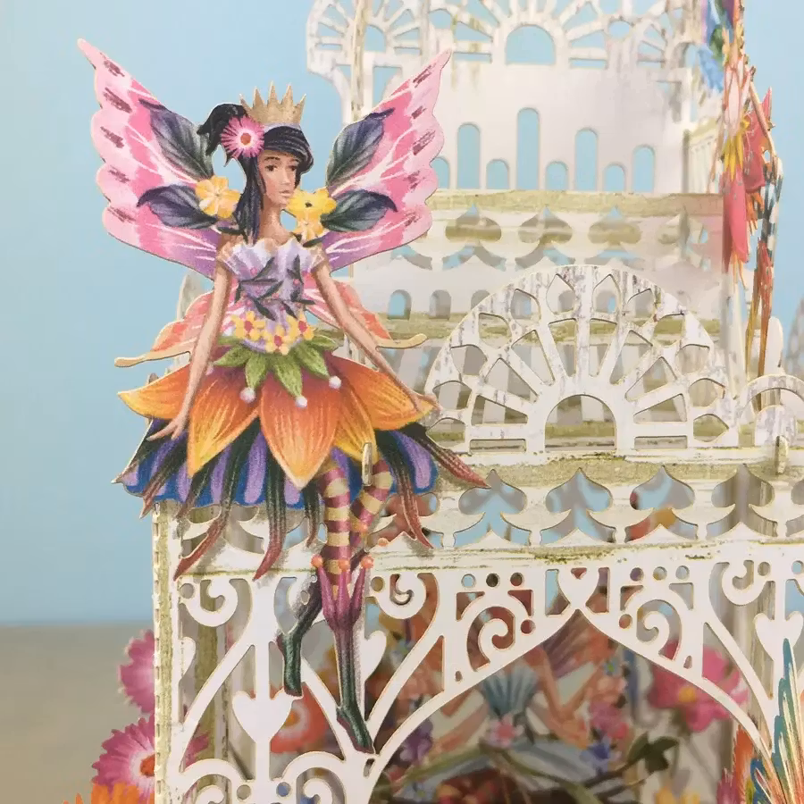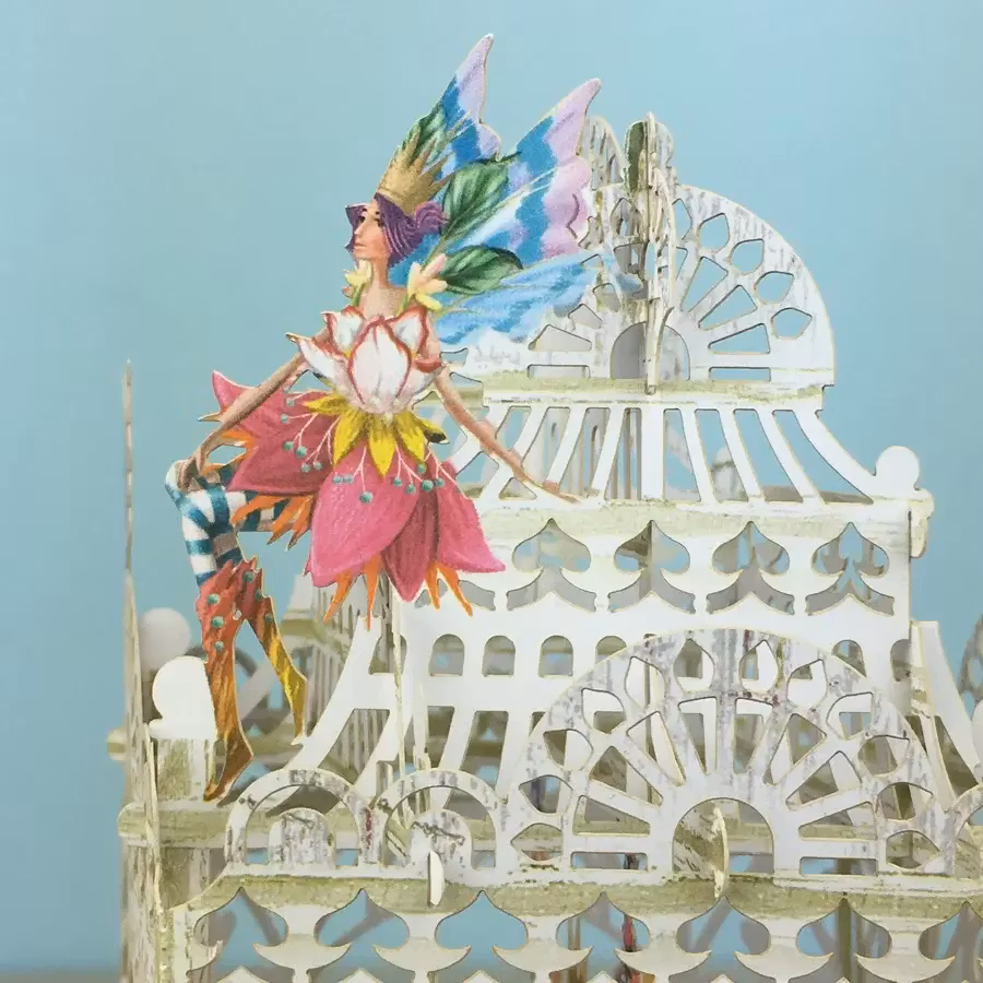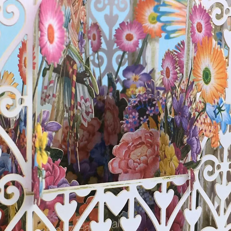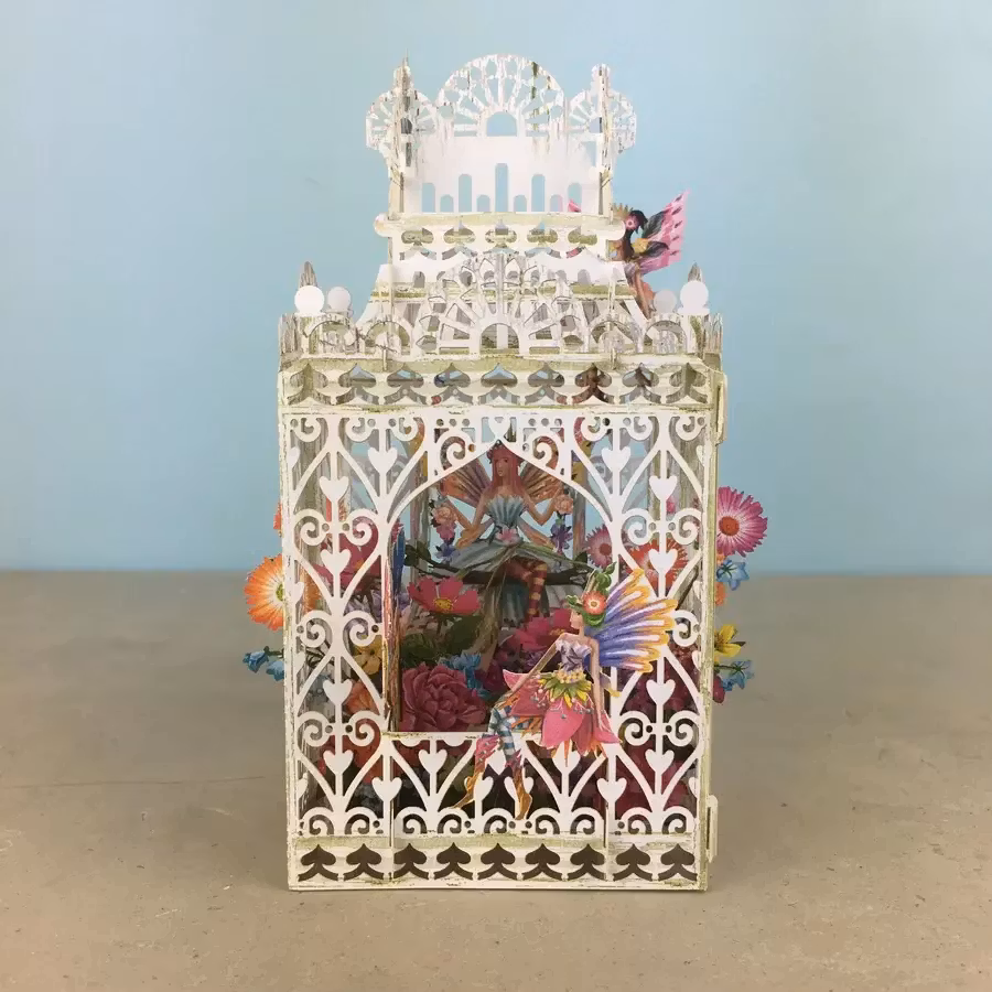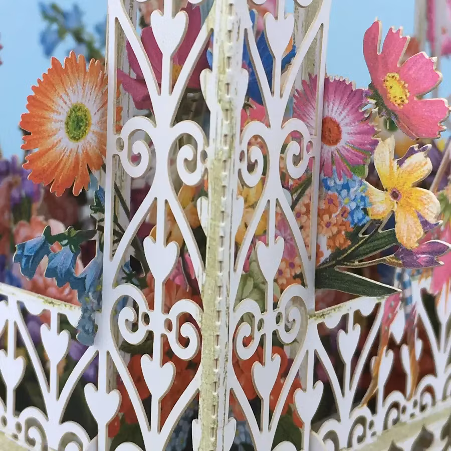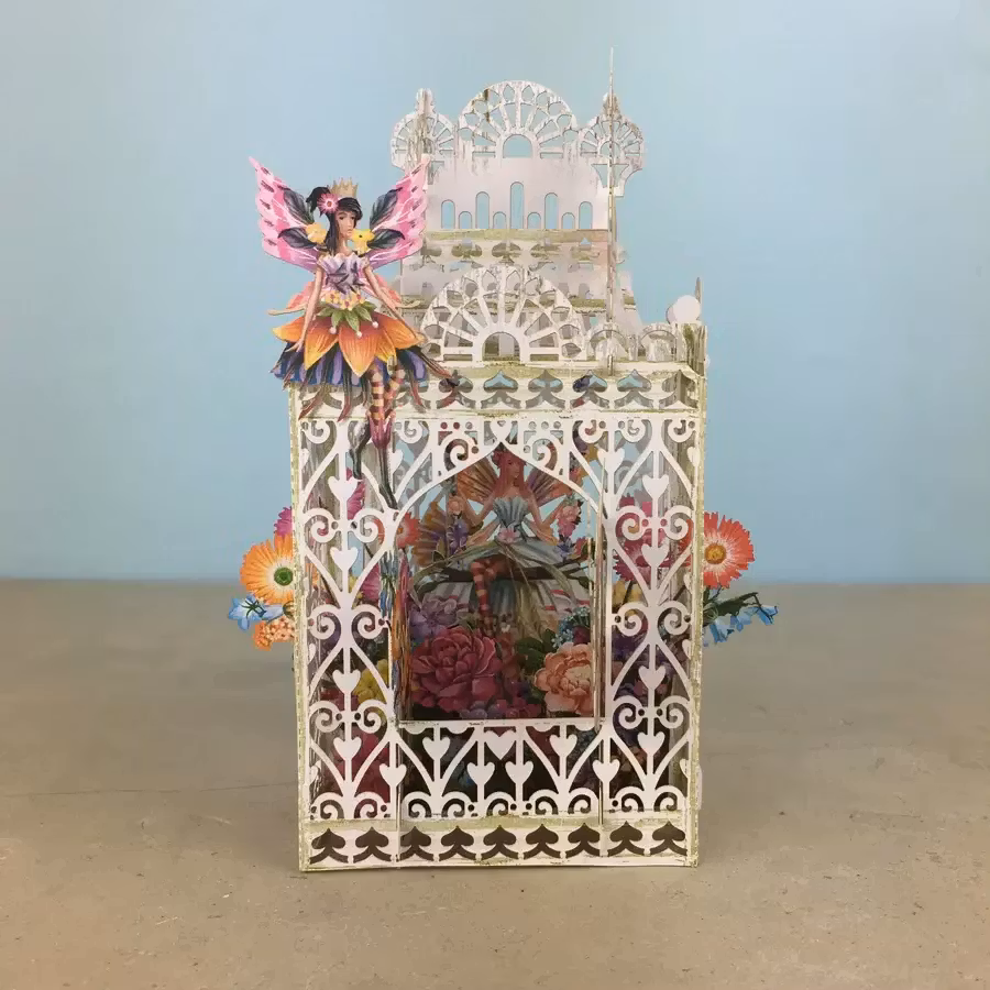 Härligt kort som levereras platt till mottagaren men som sedan viks upp och ut för att förvandlas till en vacker prydnad att ha på bordet.
