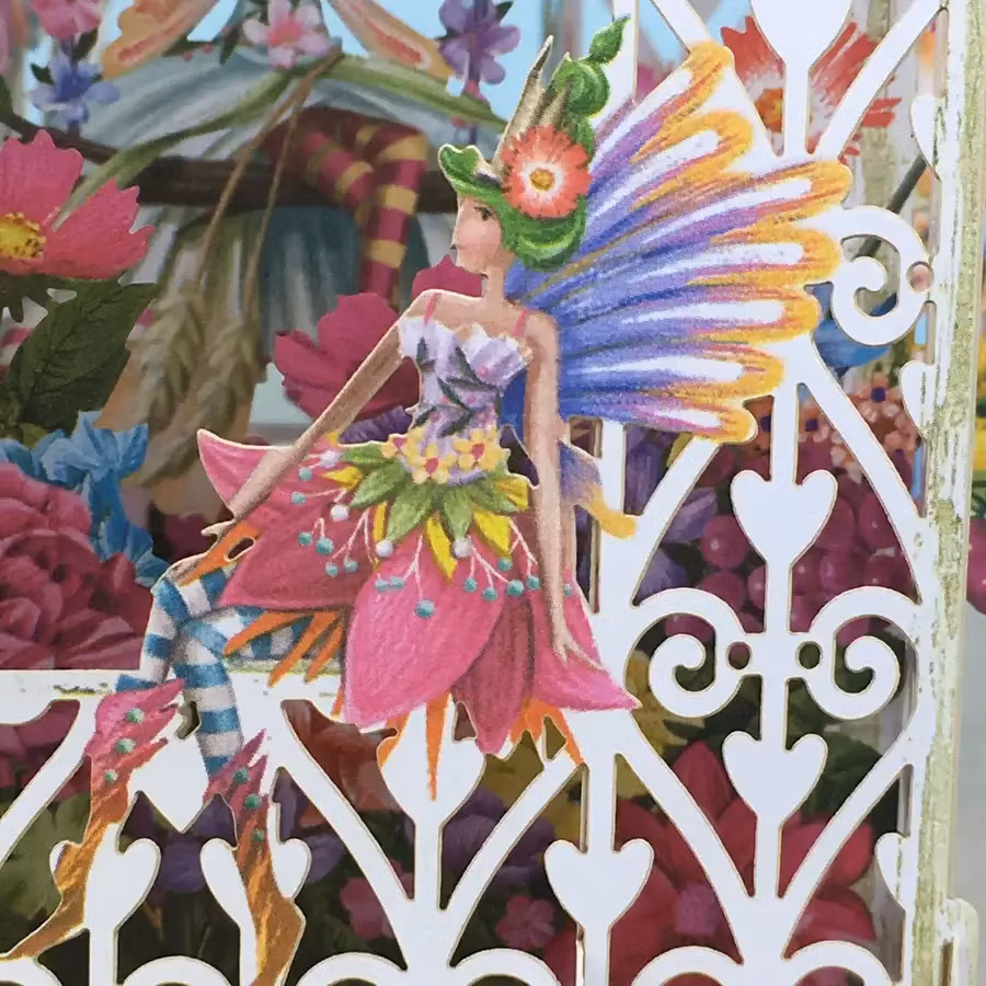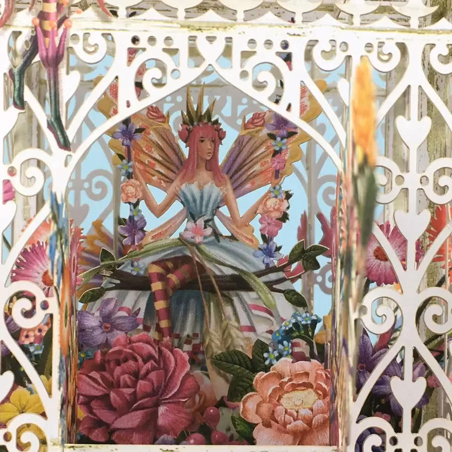 Underbart vacker lykta med blommor och älvor i överflöd.