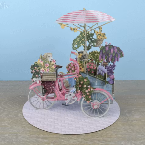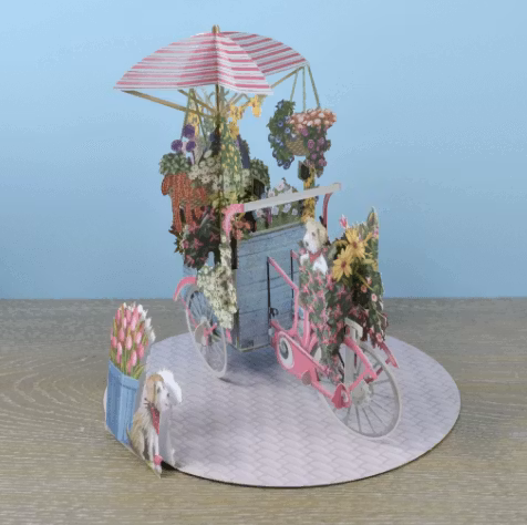Här kommer blomstervagnen med massor av blommor och en liten söt hund.