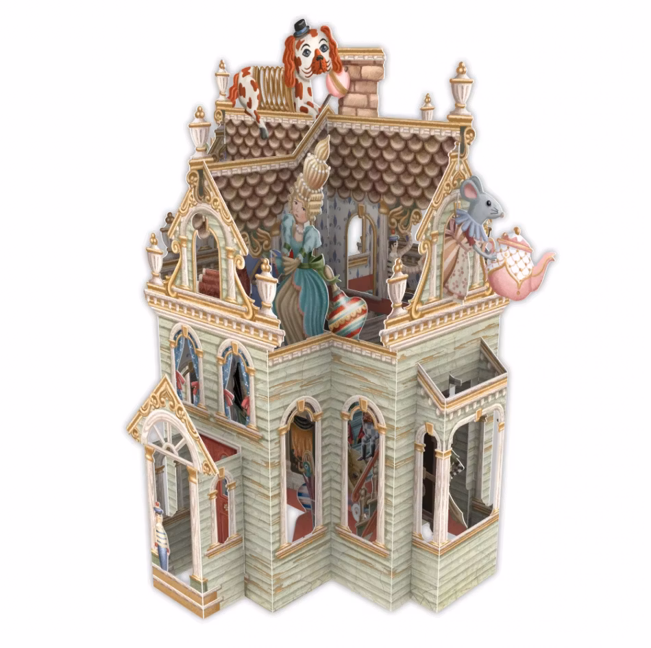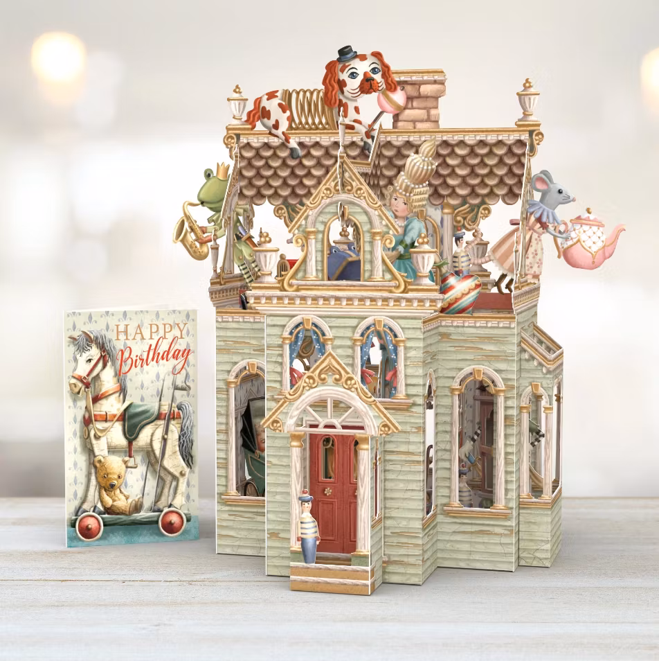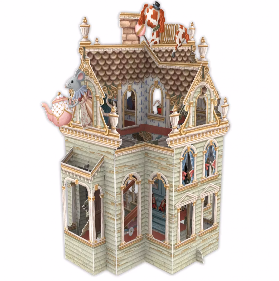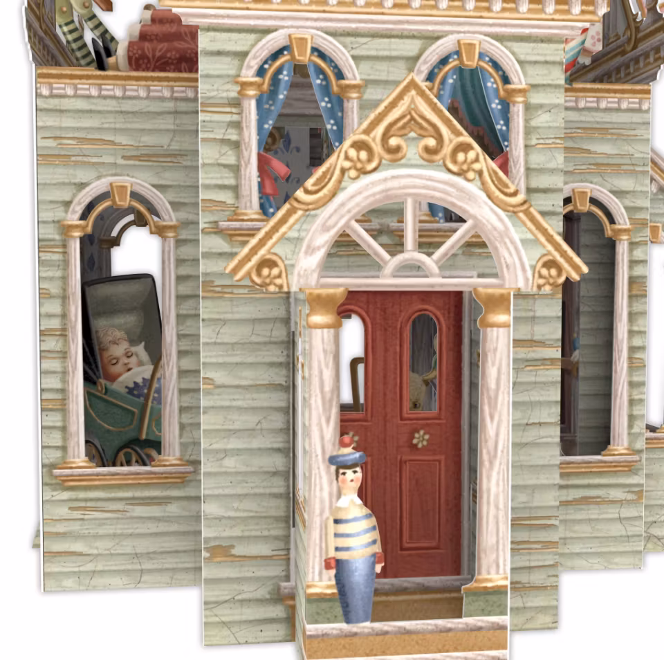 Här är motivet ett gammalt antikt dockhus. Vilka bor inne i det fina huset? Det ser du om du vänder och vrider lite på kortet.