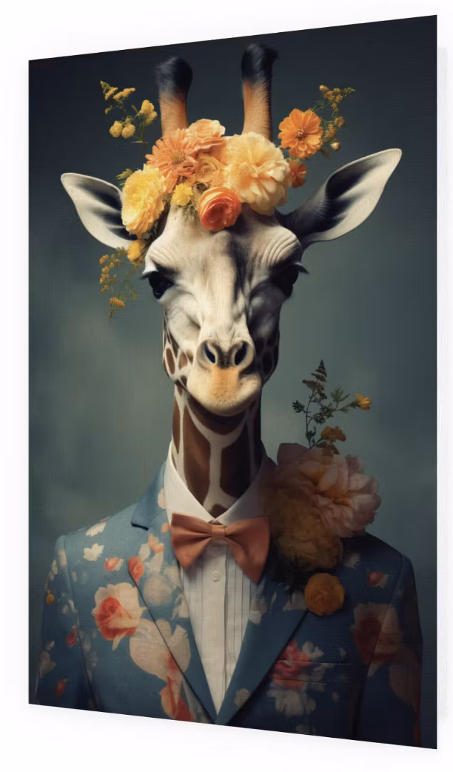 Underbart vackert kort med den vackra sagogiraffen som har gjort sig extra fin med blommor och fina kläder.