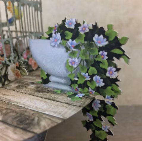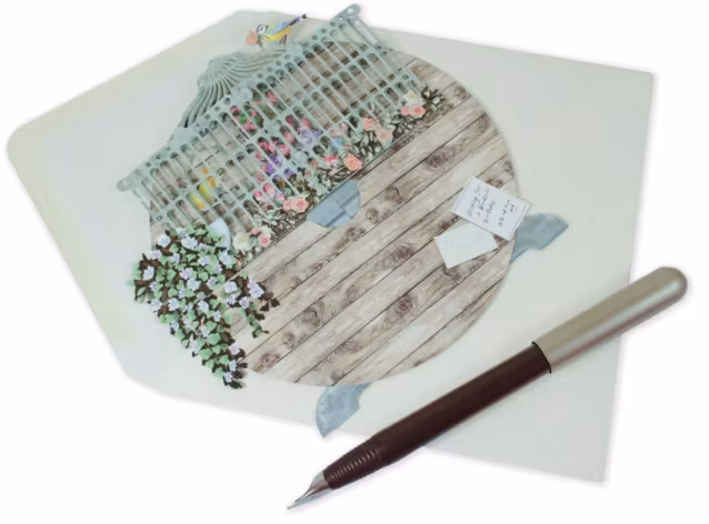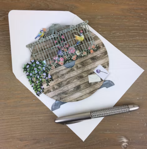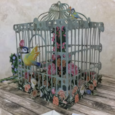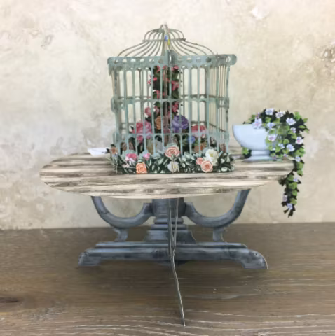 Härligt kort med motiv av ett bord med en fågelbur full med småfåglar. Underbart kort som du viker ut och viker upp.