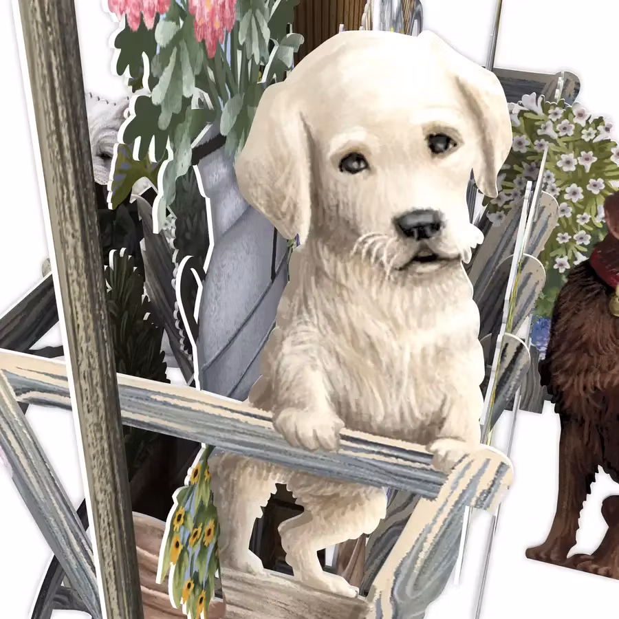 Underbart vacker vagn fylld med blommor och hundar som väntar på ett äventyr.