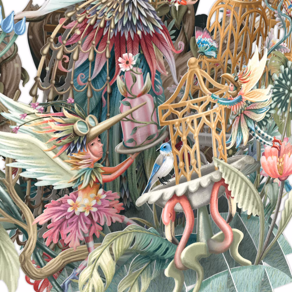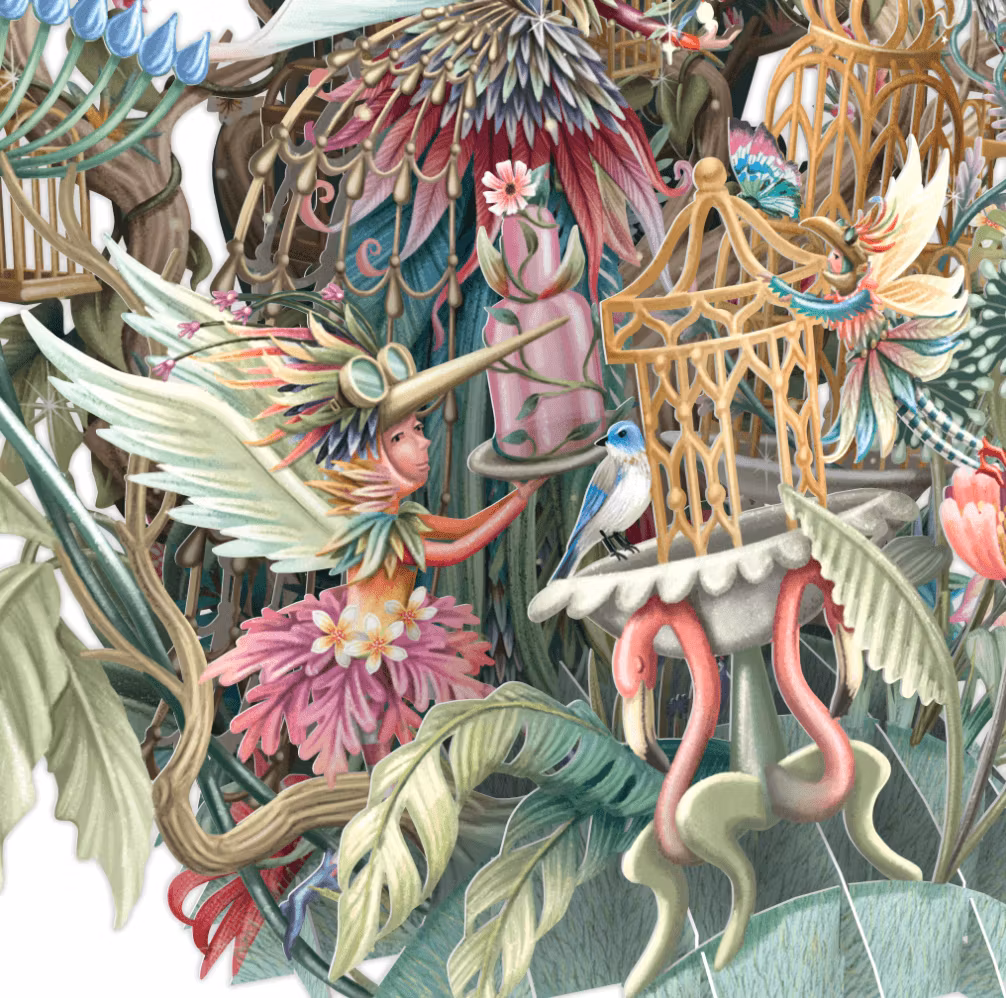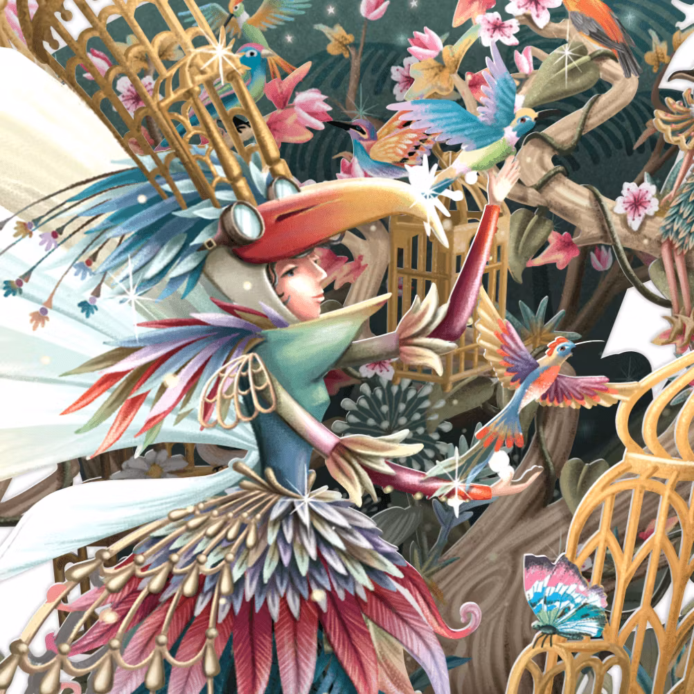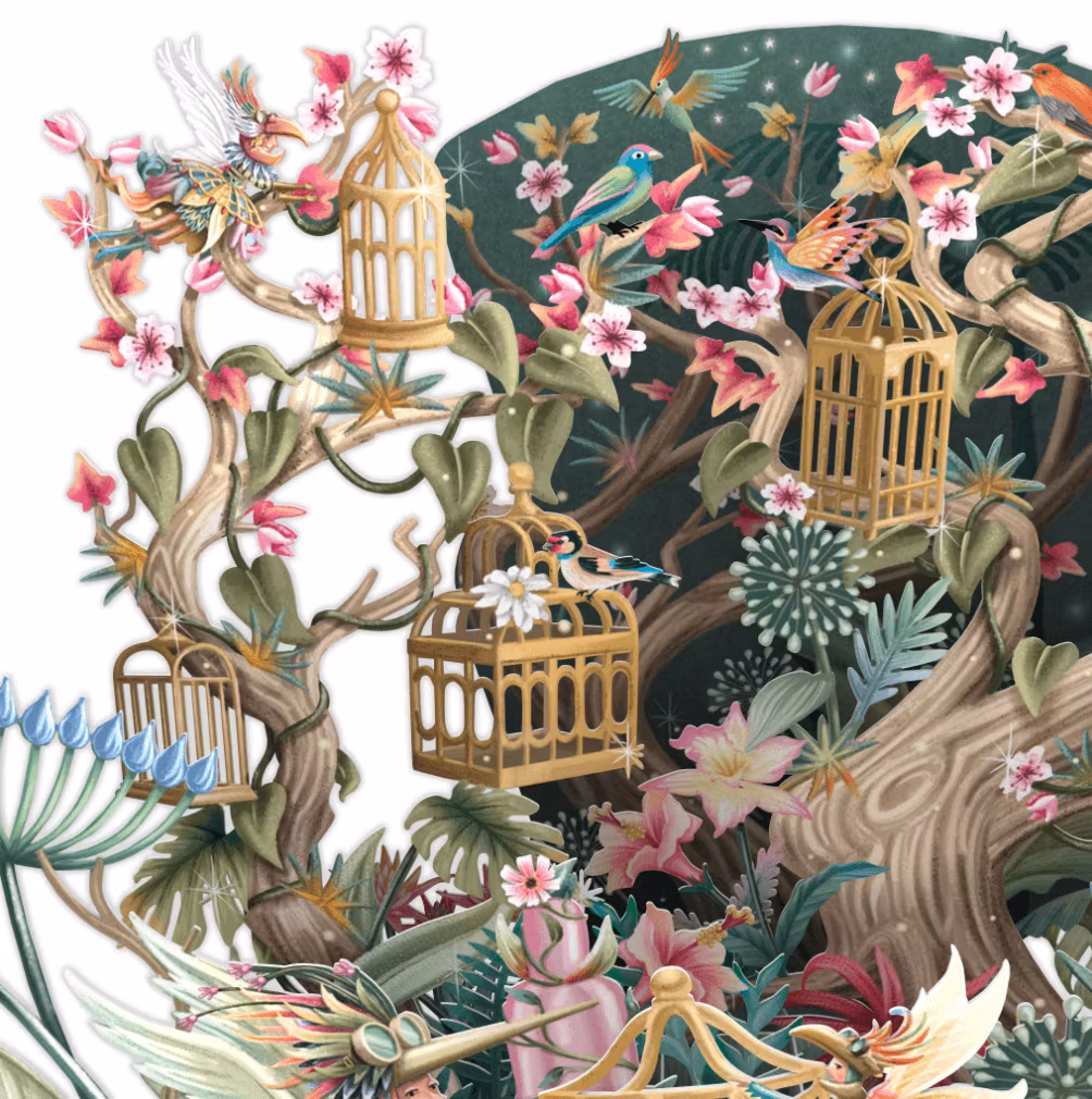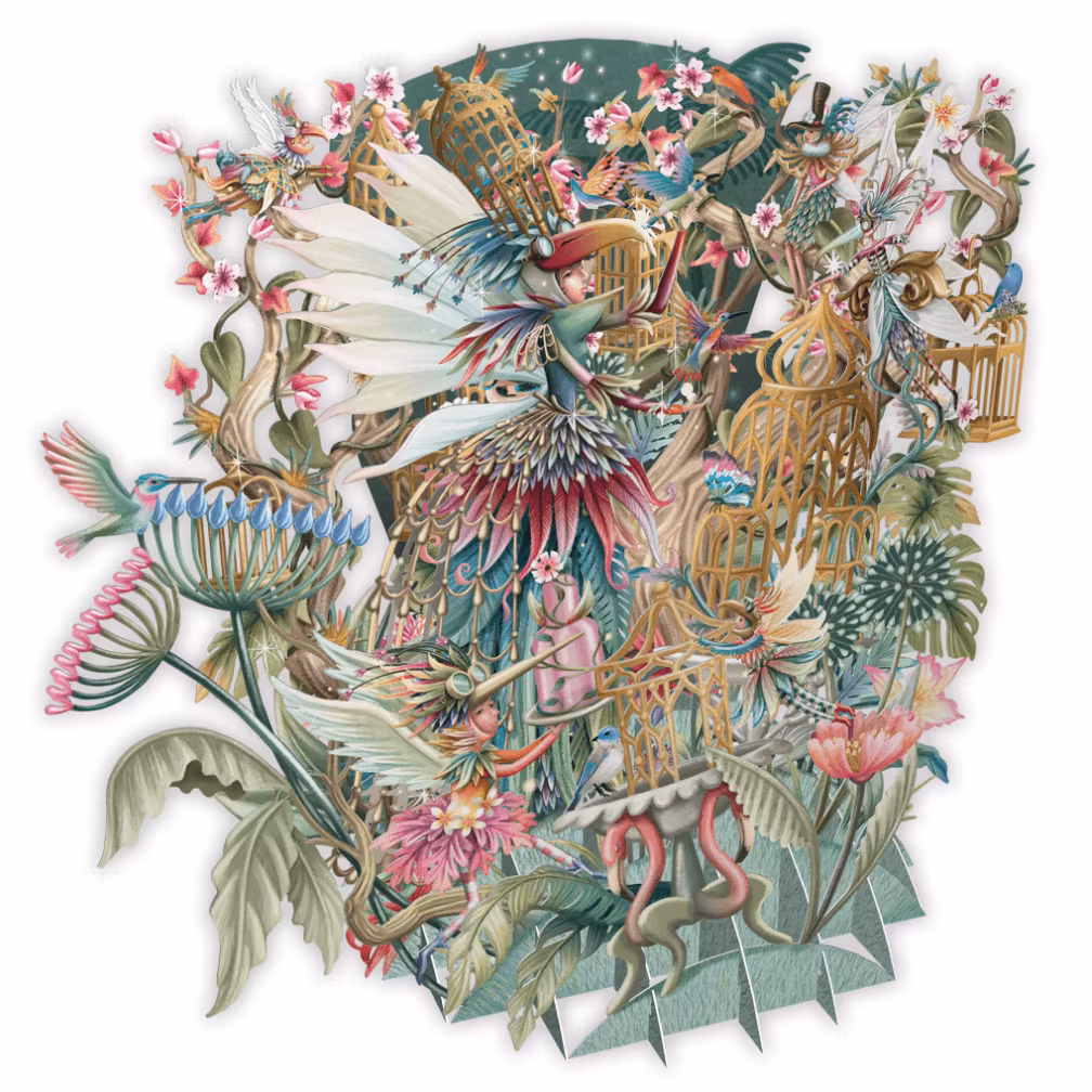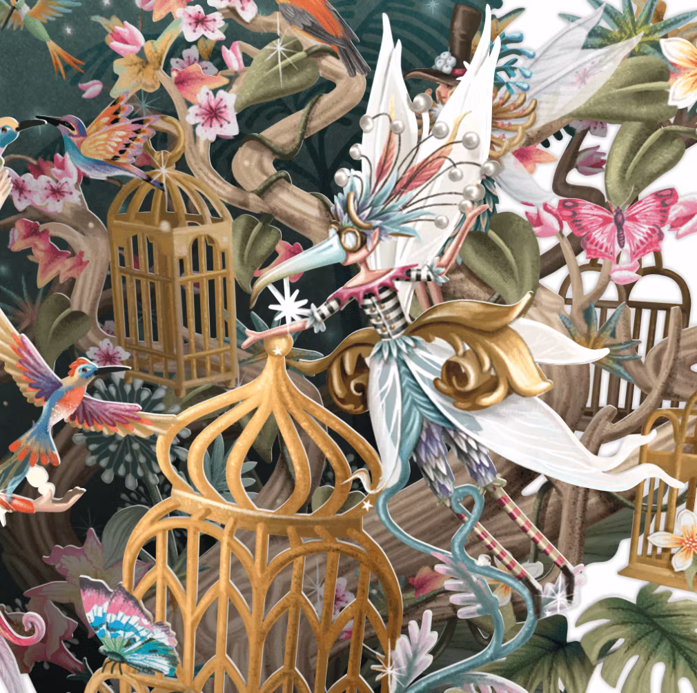 Här är motivet en massa fågelburar, fåglar, fjärilar och alver med fågelmasker. Kanske påminner motivet om Trollflöjten?