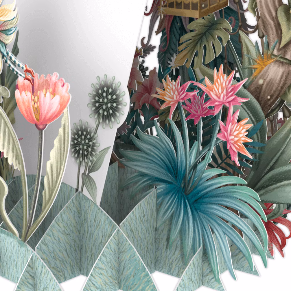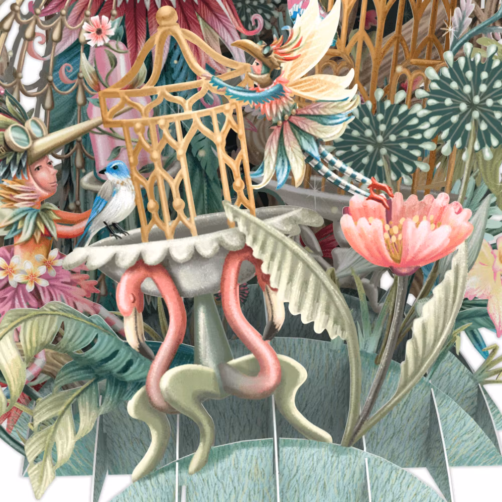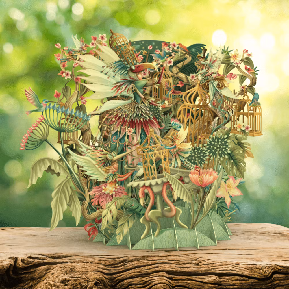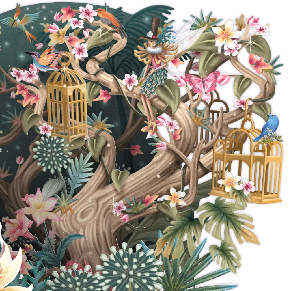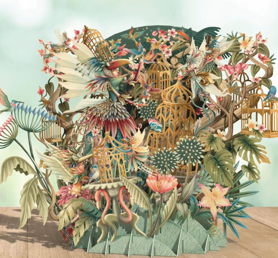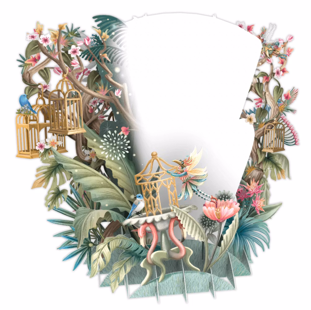 Här är motivet en massa fågelburar, fåglar, fjärilar och alver med fågelmasker. Kanske påminner motivet om Trollflöjten?