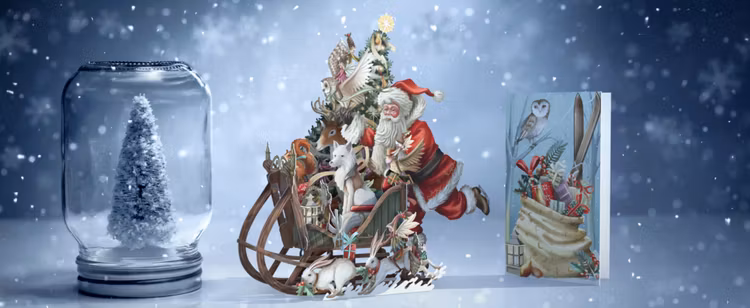 Härligt kort med motiv av tomten. släden och djuren. Ett popupkort som du viker ut och viker upp.