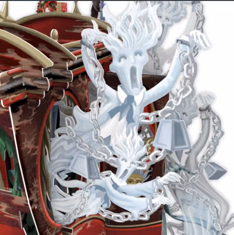 På ena sidan om kortet ser du Ebenezer Scrooge och på den andra sidan ser du julens andar som hjälps åt att omvända honom.