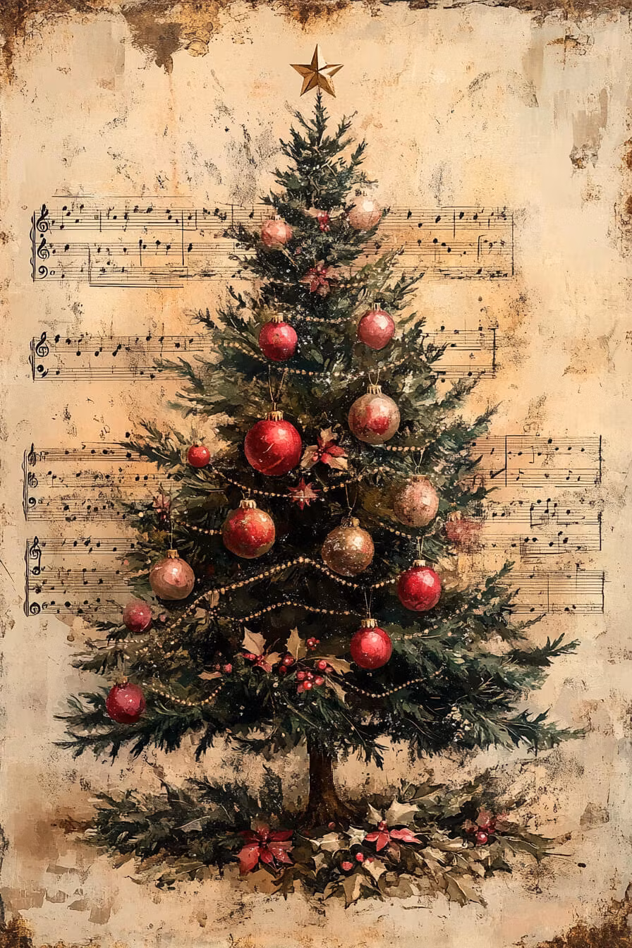 Underbart julkort med granen som står så grön, grann och klädd. Kortet har en härlig vintagekänsla med de antika notbladen i bakgrunden.