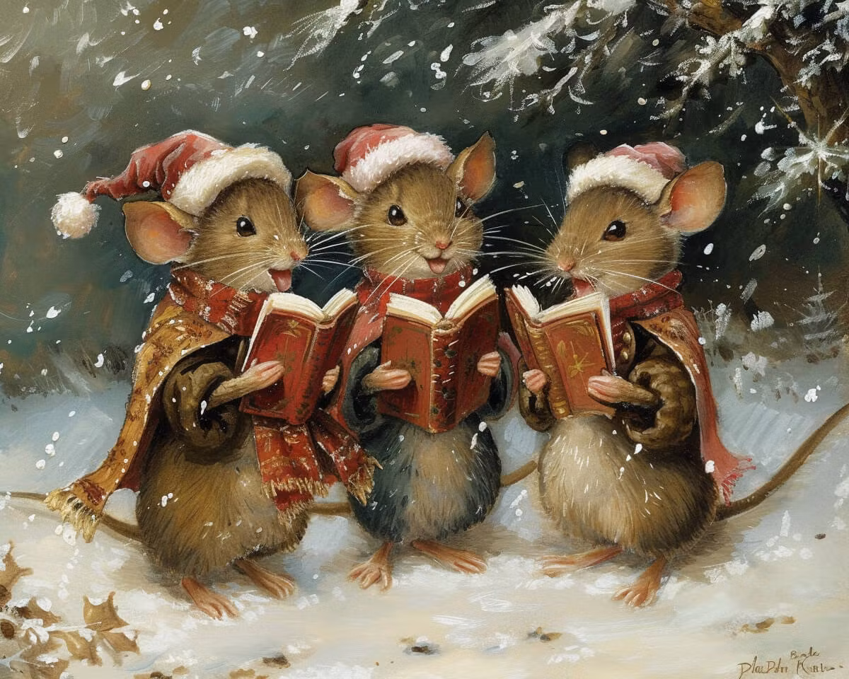 Underbart julkort med de små mössen som sjunger julsånger tillsammans.