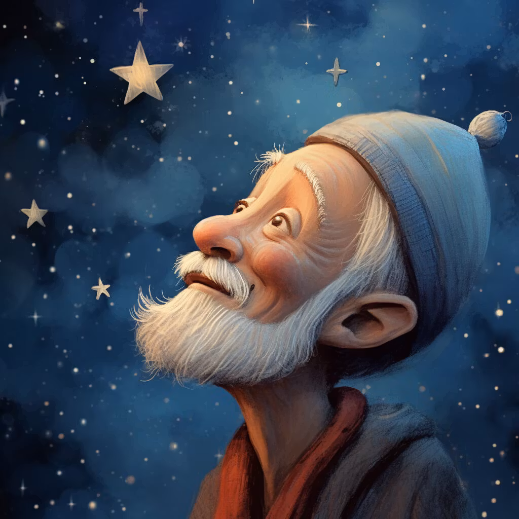 Underbart litet kort med mannen som tittar upp mot den starkt lysande stjärnan.