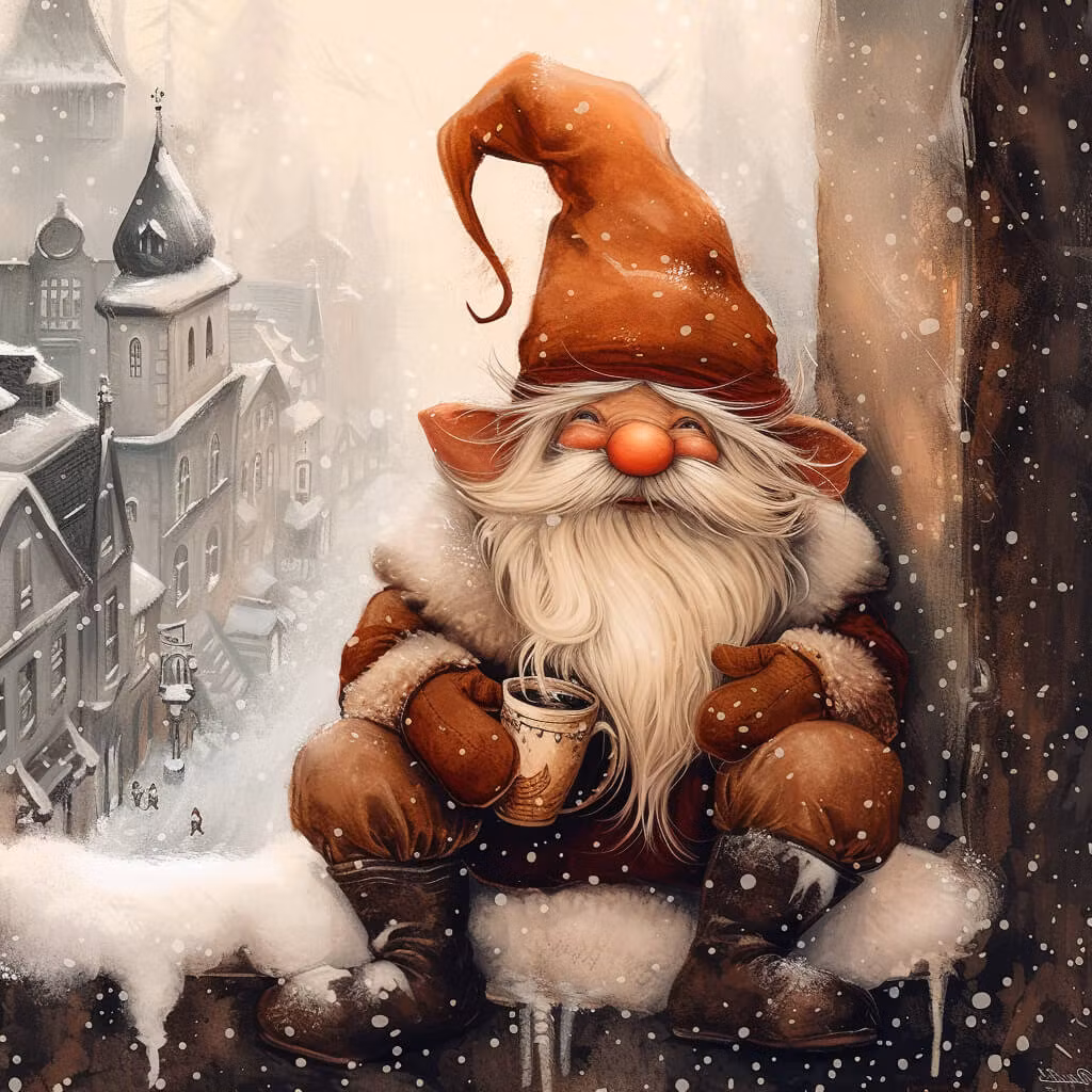 Underbart litet kort med tomten som drycker varm dryck i vinterkylan.