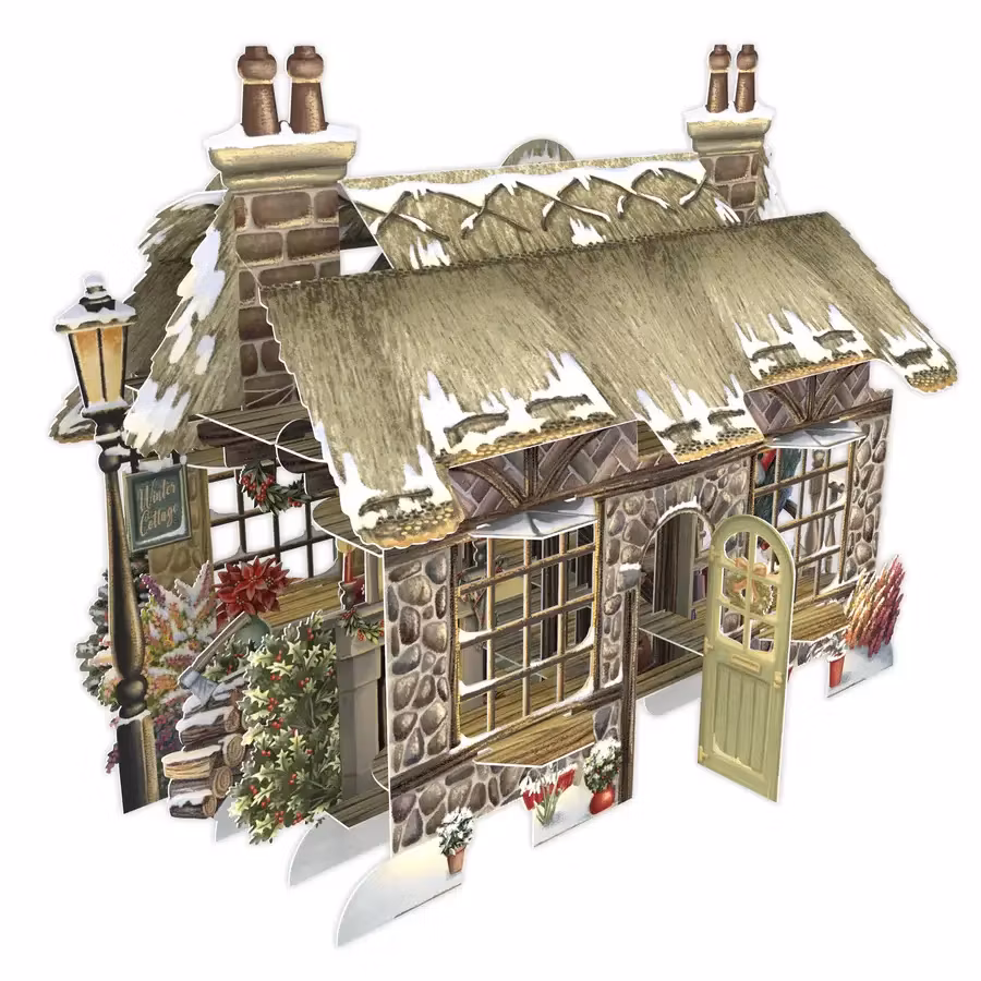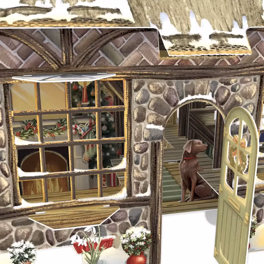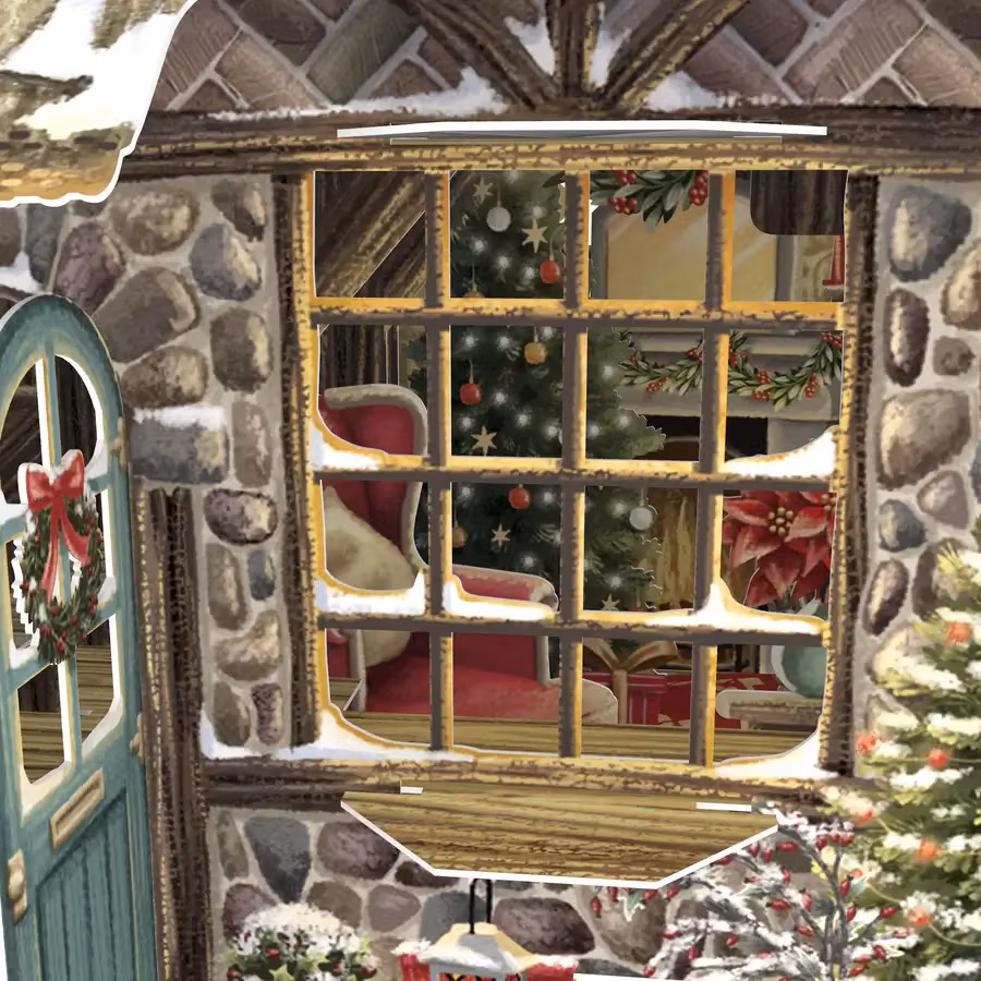 Underbart vacker julstuga där tomten precis kommit med julgranen.
