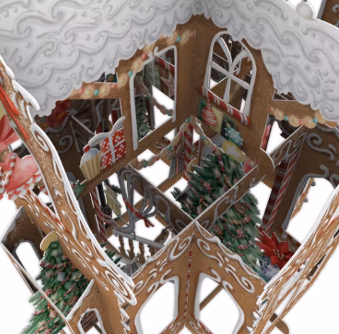 Härligt kort med motiv av ett pepparkakshus som du viker ut och viker upp.