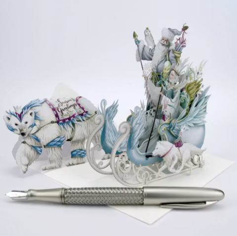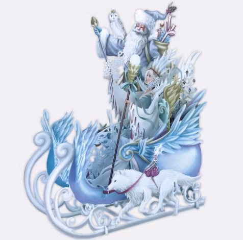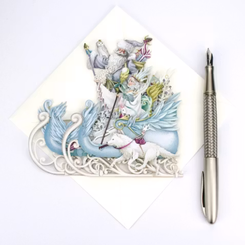 Här kommer den vackra snödrottningen tillsammans med tomten. Magnifikt kort som du viker ut och viker upp.