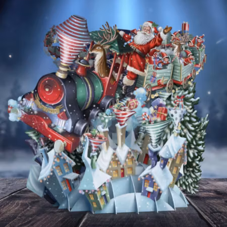 Fint kort med motiv tomtens jultåg. Underbart kort som du viker ut och viker upp.