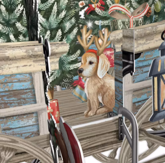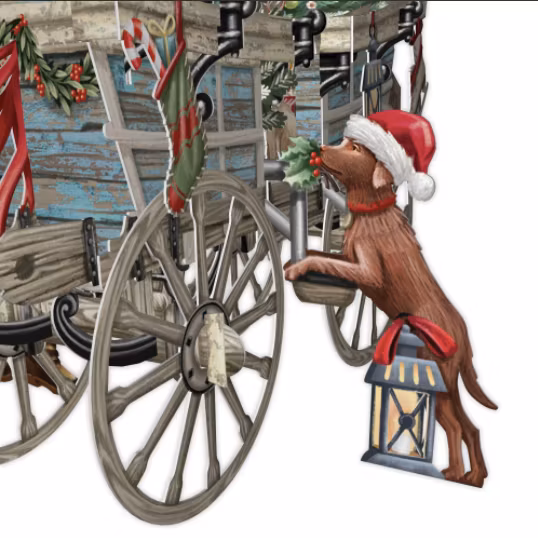 Härligt kort med motiv av tomtens vagn. Ett popupkort som du viker ut och viker upp.