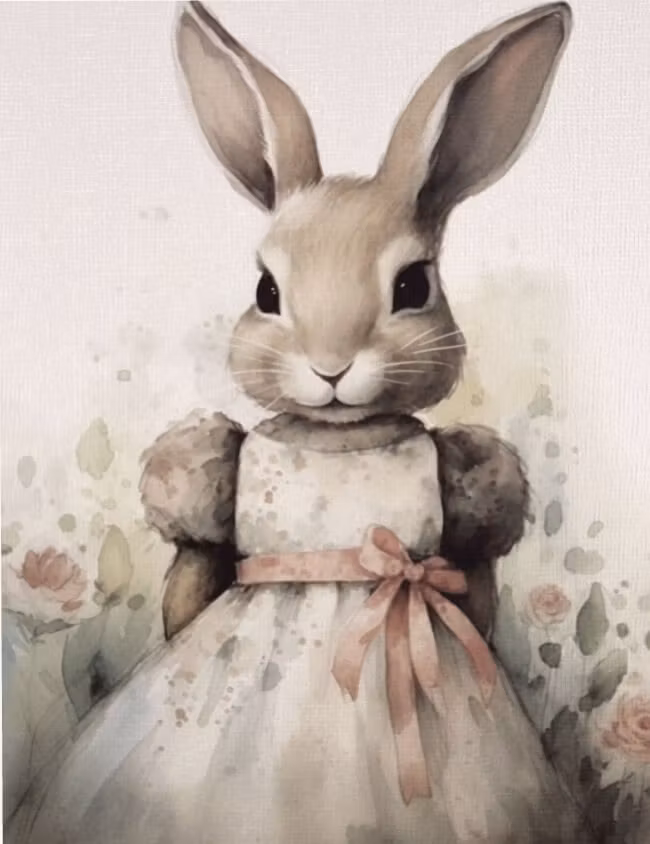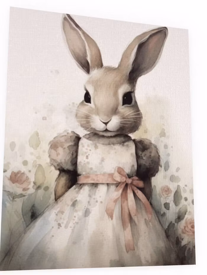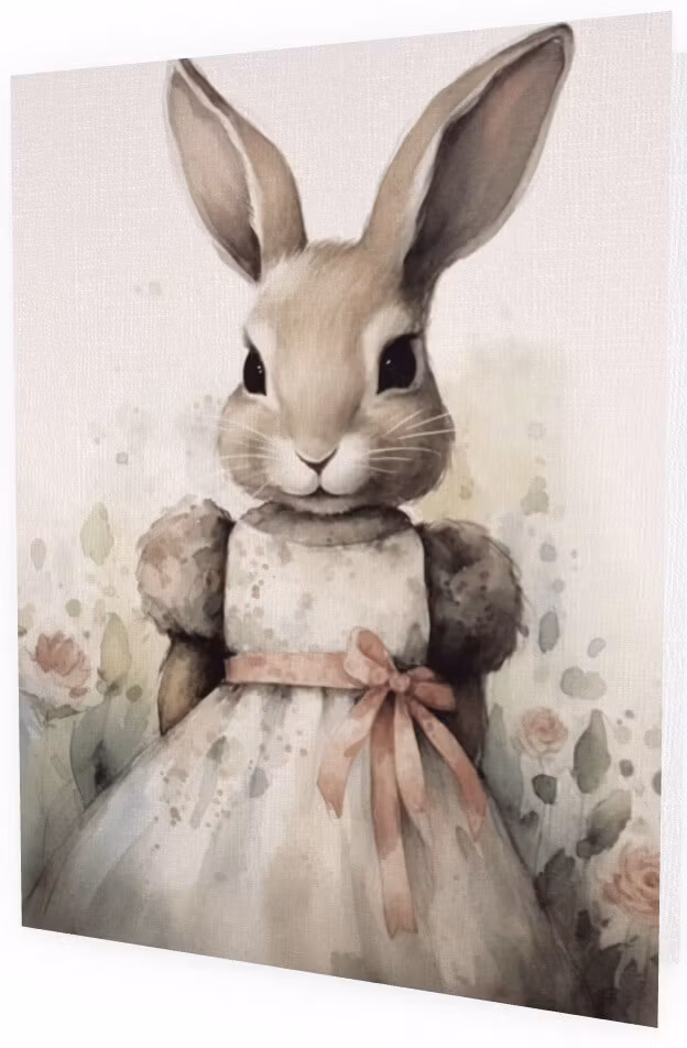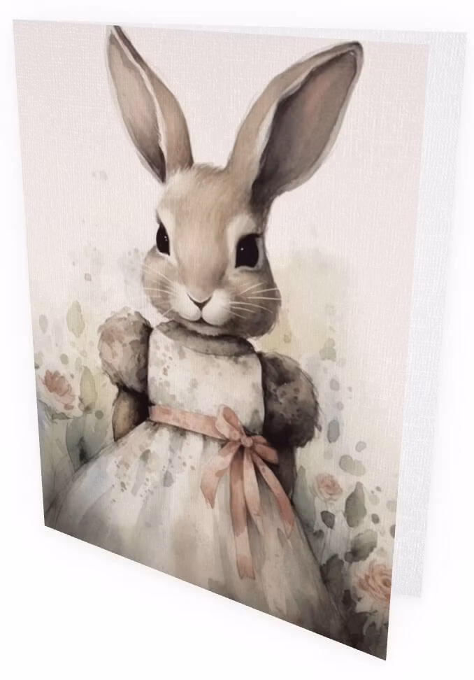 Underbart kort med kaninen i den fina klänningen, omgiven av blommor.
