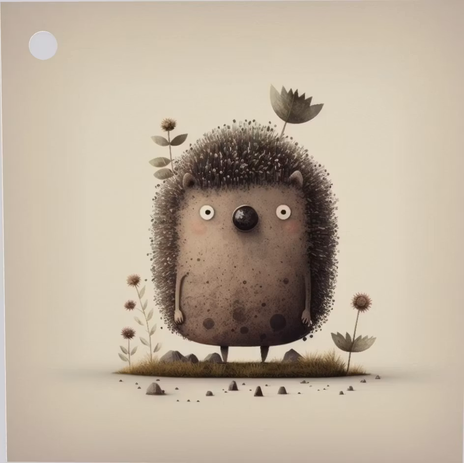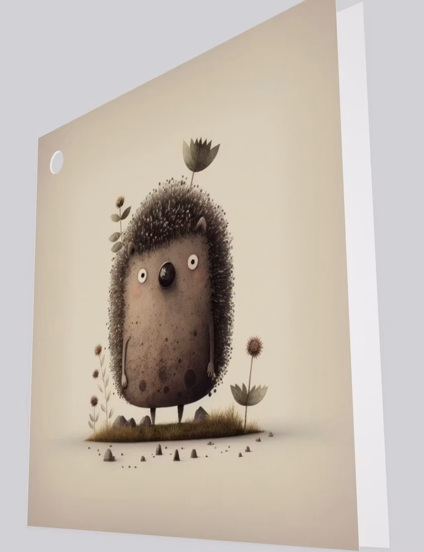 Litet kort med igelkotten som står rakt upp och ner på en liten hög med jord,